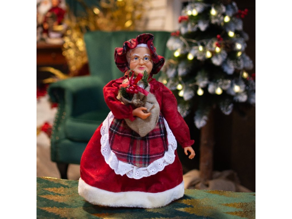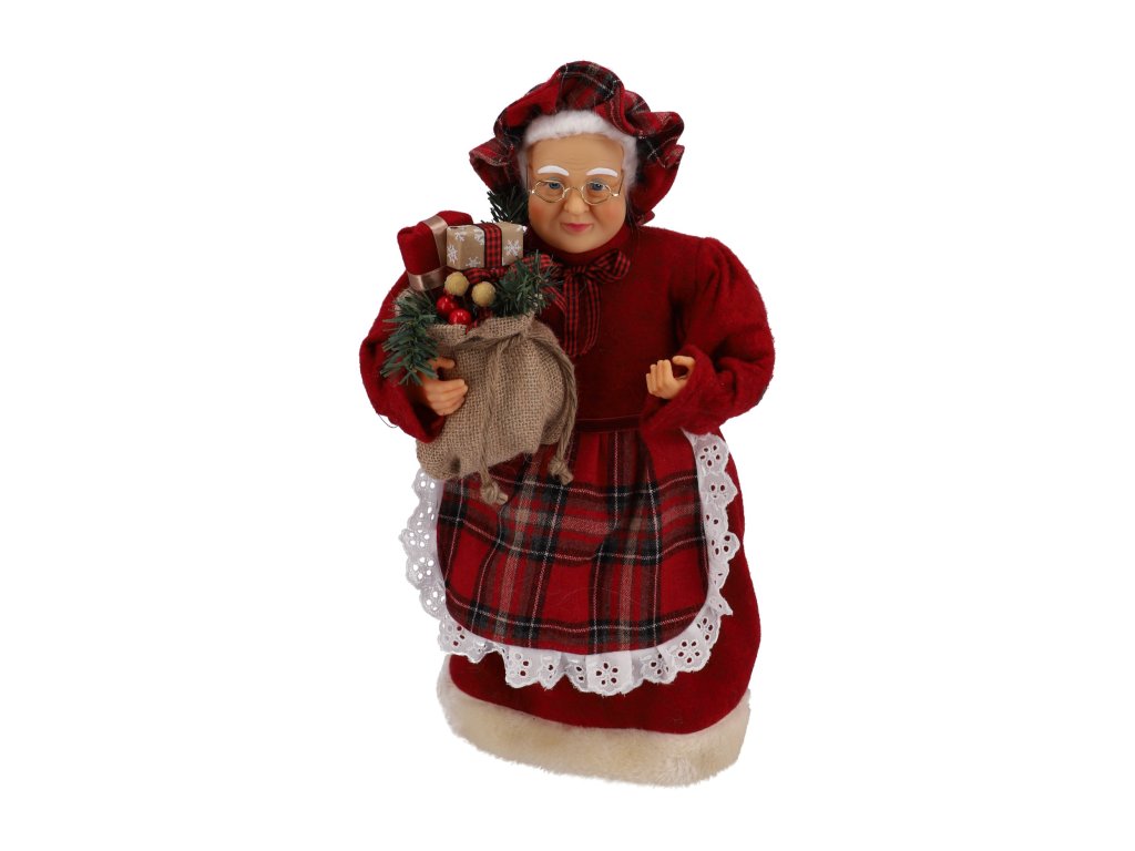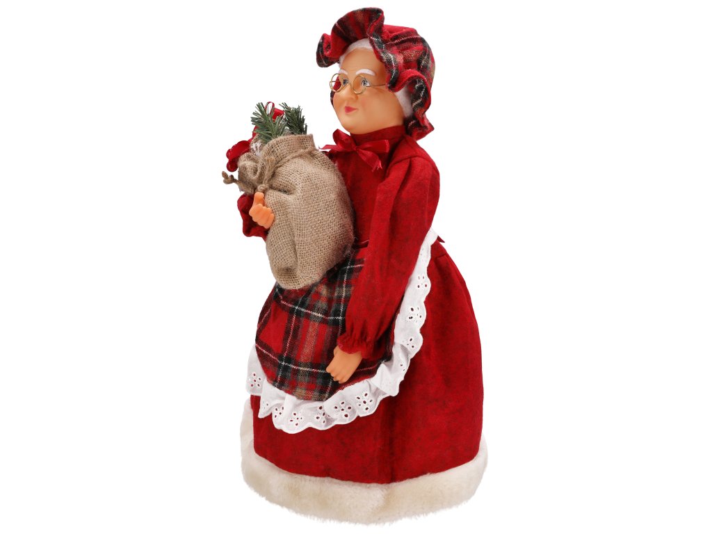 Vianočná figúrka babka Mikuláška je vyrobená z plastu, na hlave má červený klobúčik.