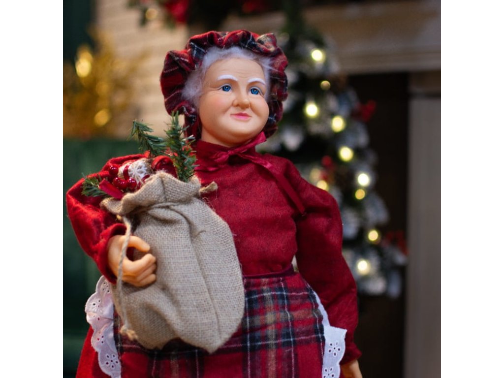 Vianočná figúrka babka Mikuláška je vyrobená z plastu, na hlave má červený klobúčik.