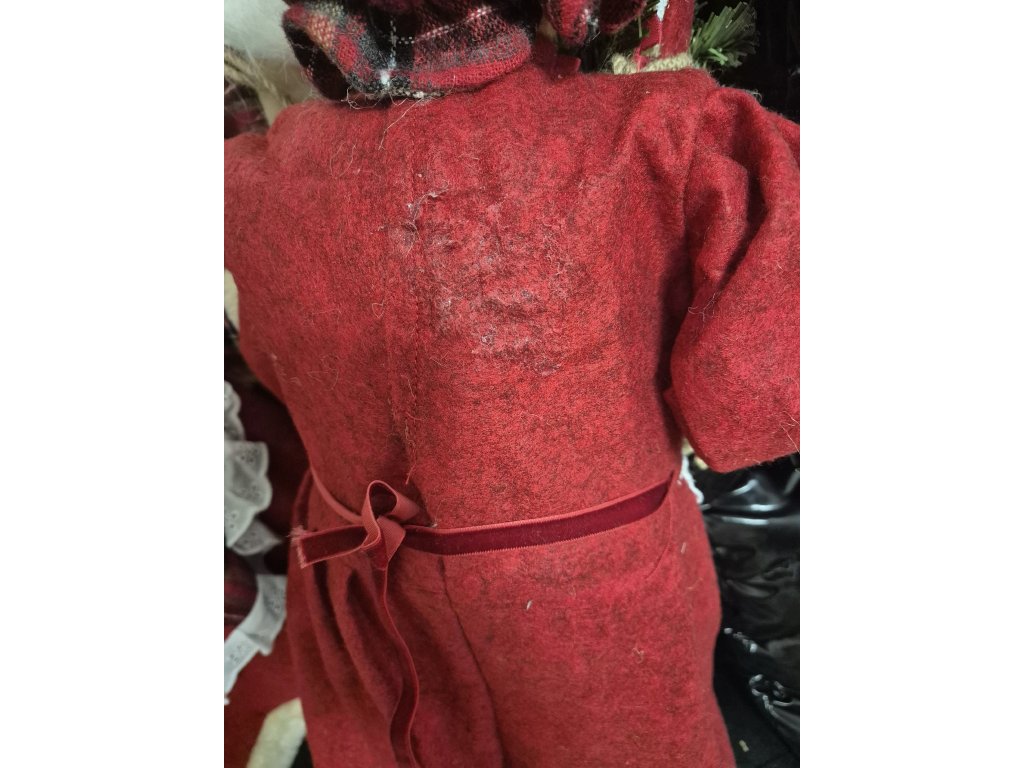 Ponúkame figúrku Babky Mikulášky so zľavou z dôvodu poškodenia zadnej časti oblečenia. Na červenom kabátiku v oblasti lopatky je zaschnuté lepidlo, čo predstavuje zanedbateľnú vadu tejto dekorácie (viď foto).