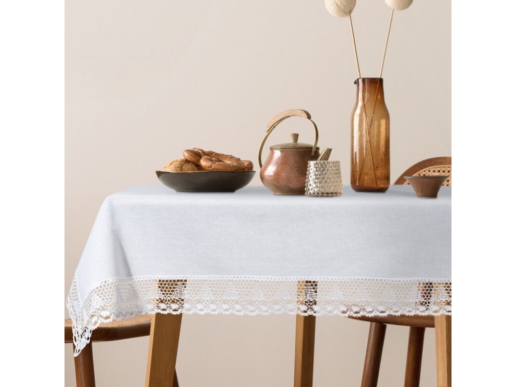 Ľahká a vzdušná tkanina je príjemná na dotyk, odolná proti pokrčeniu a vždy pôsobí upravene. Jemná čipka zdobiaca okraje vnáša do priestoru romantický šarm a premení každé stolovanie na jedinečný zážitok.
