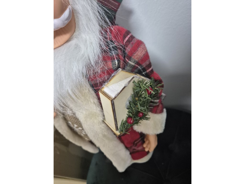 Ponúkame figúrku Dedka Mikuláša so zľavou z dôvodu poškodenia búdky, ktorú drží v ruke. Na búdke chýba vrchná časť - strieška, čo predstavuje zanedbateľnú vadu tejto dekorácie (viď foto).