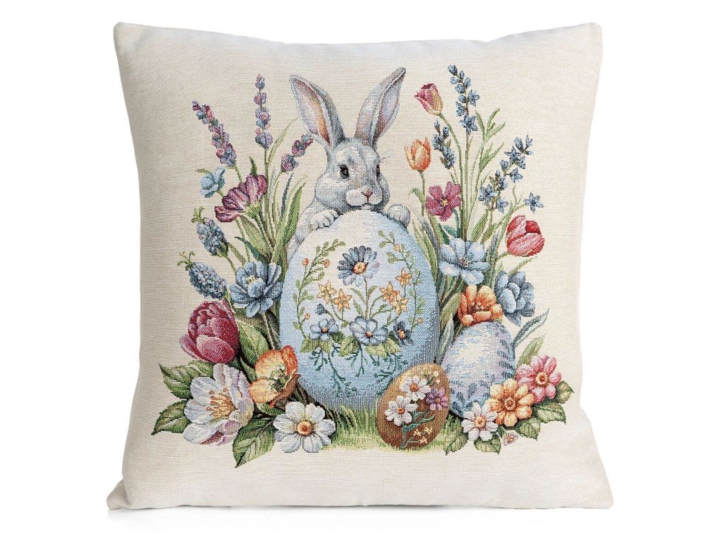 Krásna gobelínová obliečka na vankúš s motívom roztomilého zajačika, zdobenej kraslice a bohatých jarných kvetov vnesie do vášho domova sviežu jarnú a veľkonočnú atmosféru.