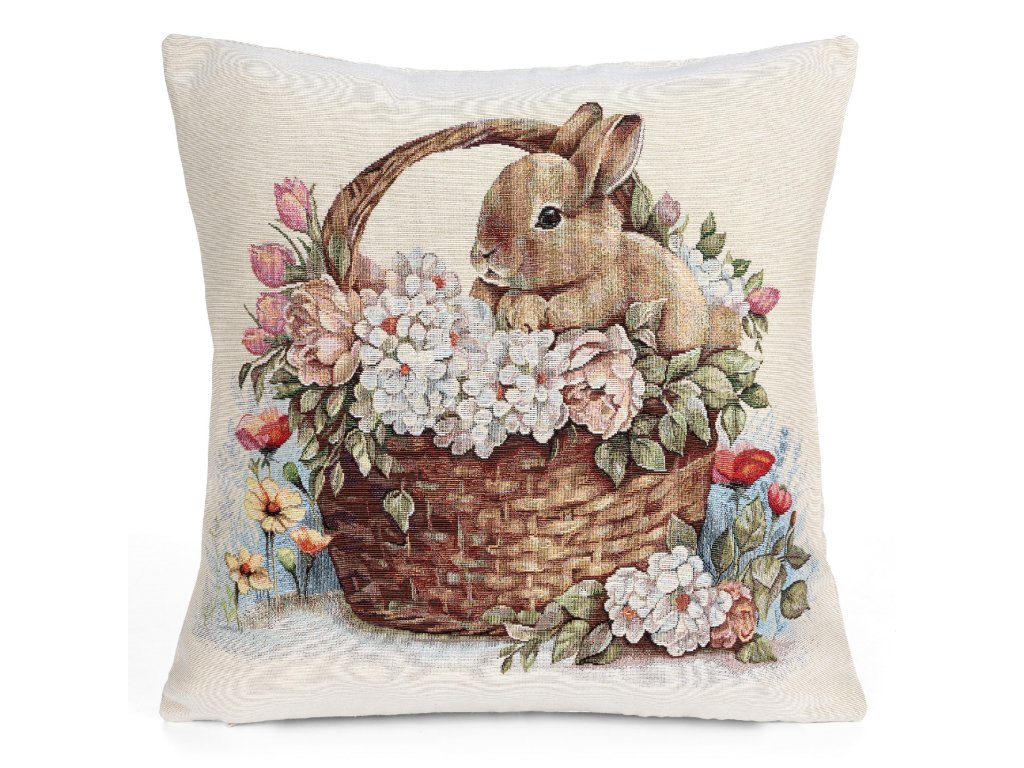 Dekoračná gobelínová obliečka na vankúš so zajačikom v košíku