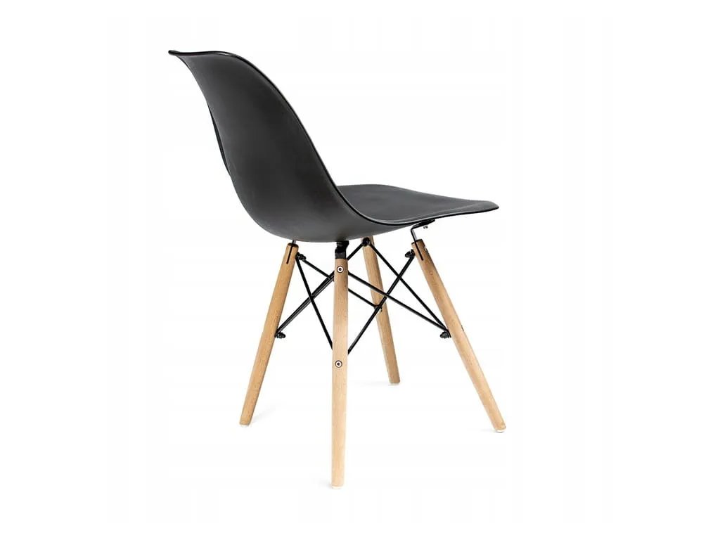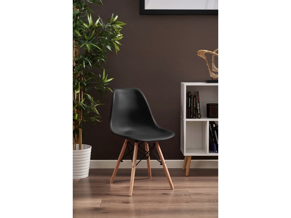 Ergonomicky tvarované sedadlo z odolného polypropylénu je navrhnuté pre pohodlné každodenné sedenie. Stabilitu zabezpečujú nohy z masívneho bukového dreva, ktoré pôsobia prirodzene a zároveň sú pevné. Charakteristickým detailom sú kontrastné spojky, ktoré spevňujú konštrukciu a zároveň slúžia ako dizajnový akcent.