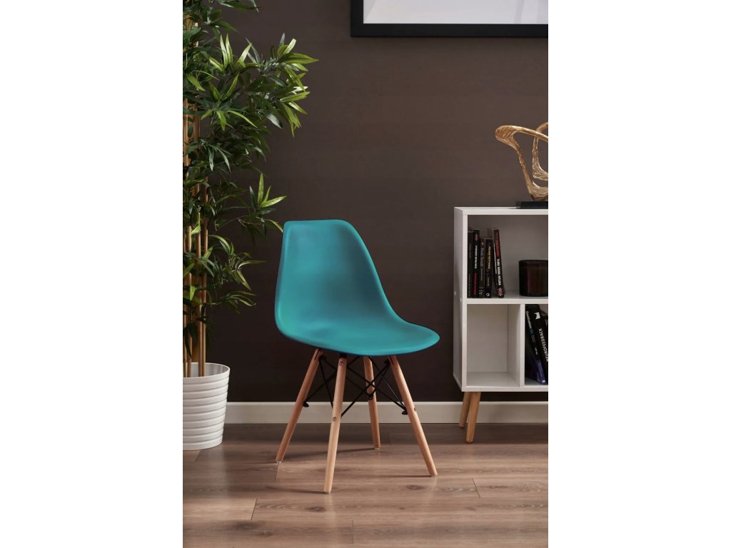 Ergonomicky tvarované sedadlo z odolného polypropylénu je navrhnuté pre pohodlné každodenné sedenie. Stabilitu zabezpečujú nohy z masívneho bukového dreva, ktoré pôsobia prirodzene a zároveň sú pevné. Charakteristickým detailom sú kontrastné spojky, ktoré spevňujú konštrukciu a zároveň slúžia ako dizajnový akcent.