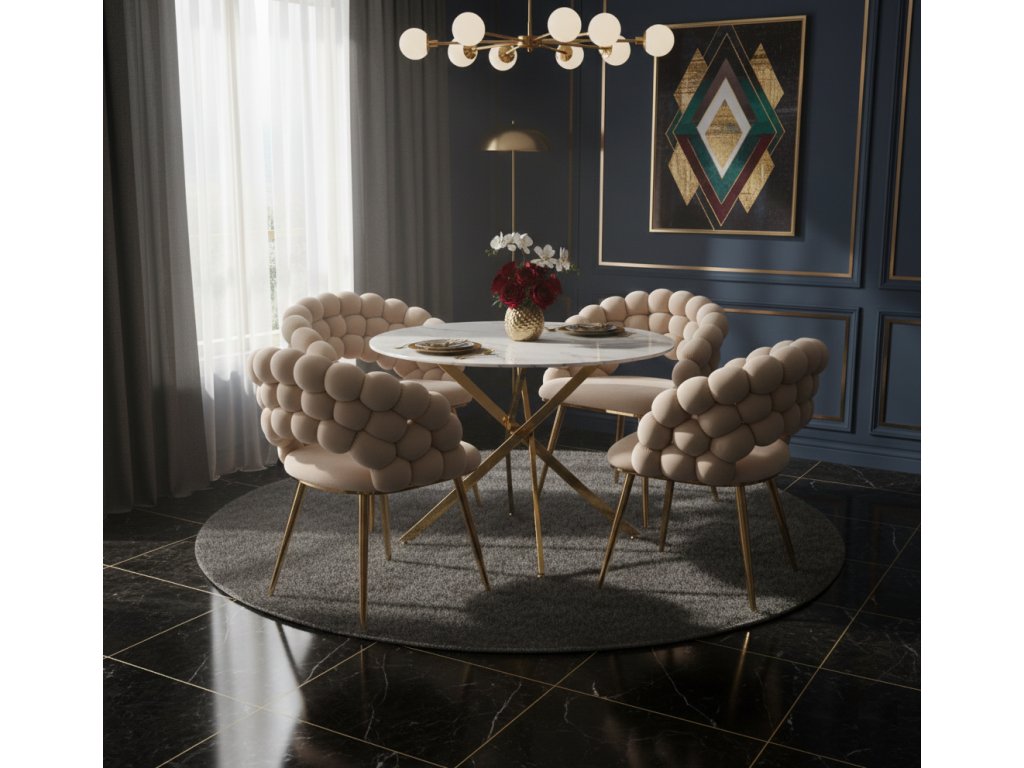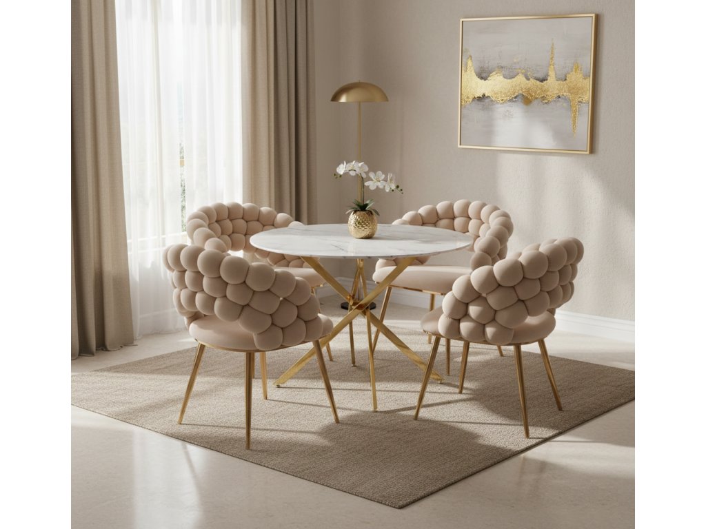 Stabilná chromová konštrukcia v zlatej farbe zabezpečuje pevnosť, dlhú životnosť a zároveň podčiarkuje exkluzívny charakter stoličky. Ergonomický tvar sedadla poskytuje pohodlné sedenie aj pri dlhšom používaní, vďaka čomu je stolička ideálna nielen do jedálne, ale aj do obývačky, spálne, pracovne či štýlového kozmetického kútika.