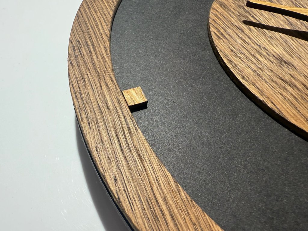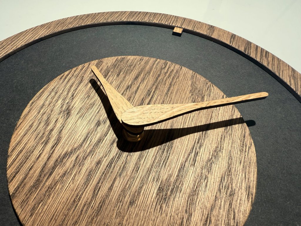 Ciferník je vyrobený z dubovej dyhy a jemné drevené ručičky podčiarkujú elegantný, minimalistický charakter. K dispozícii v dvoch farebných vyhotoveniach: