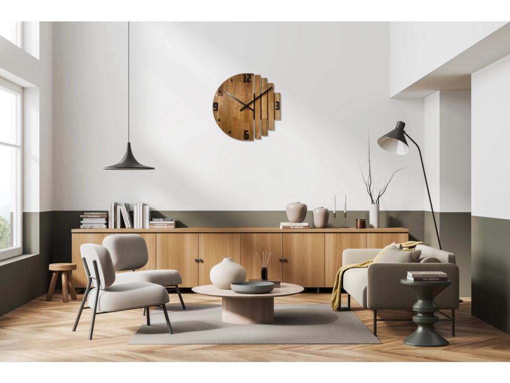 Hodiny Asymetria dokonale dopĺňajú moderné obývačky, kde sa stanú centrálnym bodom steny, ale rovnako dobre sa hodia aj do klasických interiérov. Kombinujte ich s ďalšími drevenými doplnkami v dubovom odtieni a vytvoríte harmonický celok plný prirodzenej elegancie.