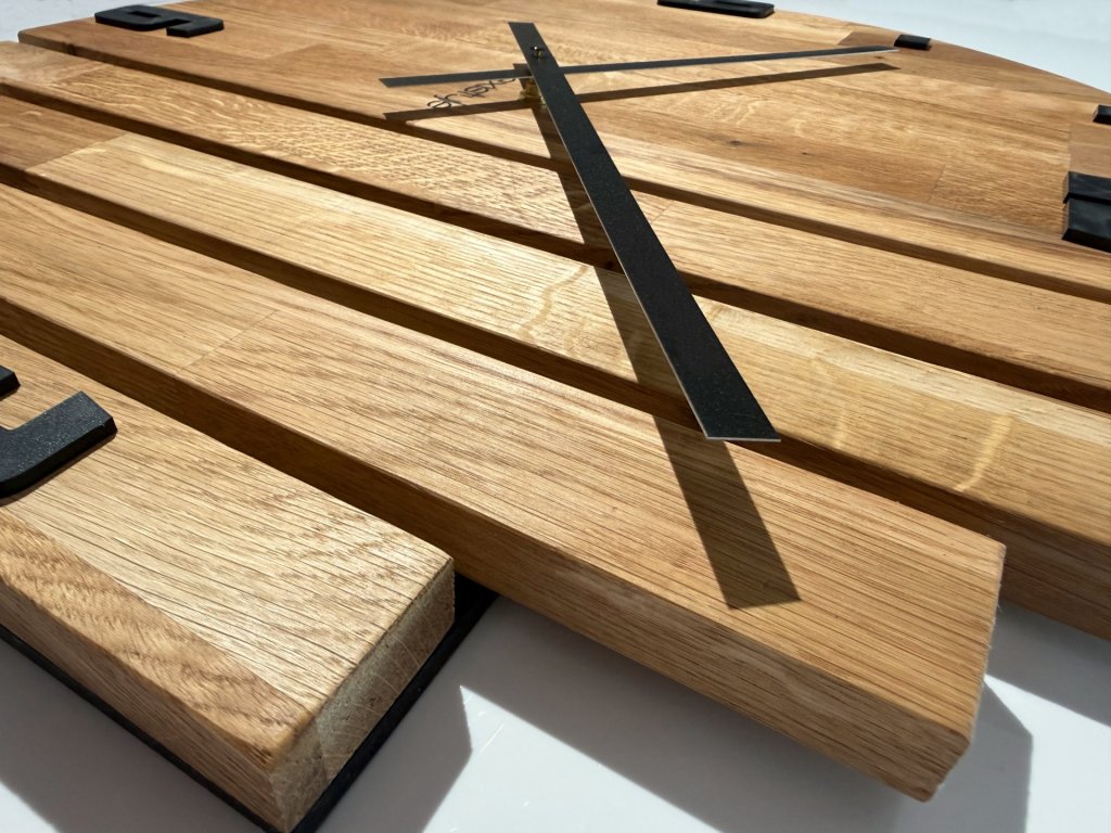 Hodiny sú vyrobené z prírodného dubového dreva, kde každý diel je ručne brúsený a ošetrený olejom pre zvýraznenie prírodného usloženia. Väčší priemer 50 cm robí z hodín nielen praktický čas merač, ale aj výraznú dekoráciu steny. Tichý mechanizmus zaisťuje plynulý chod bez rušivého tikania.