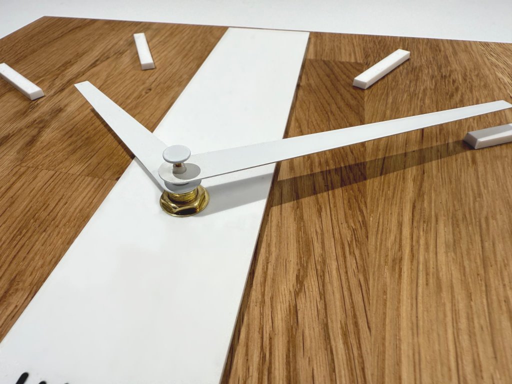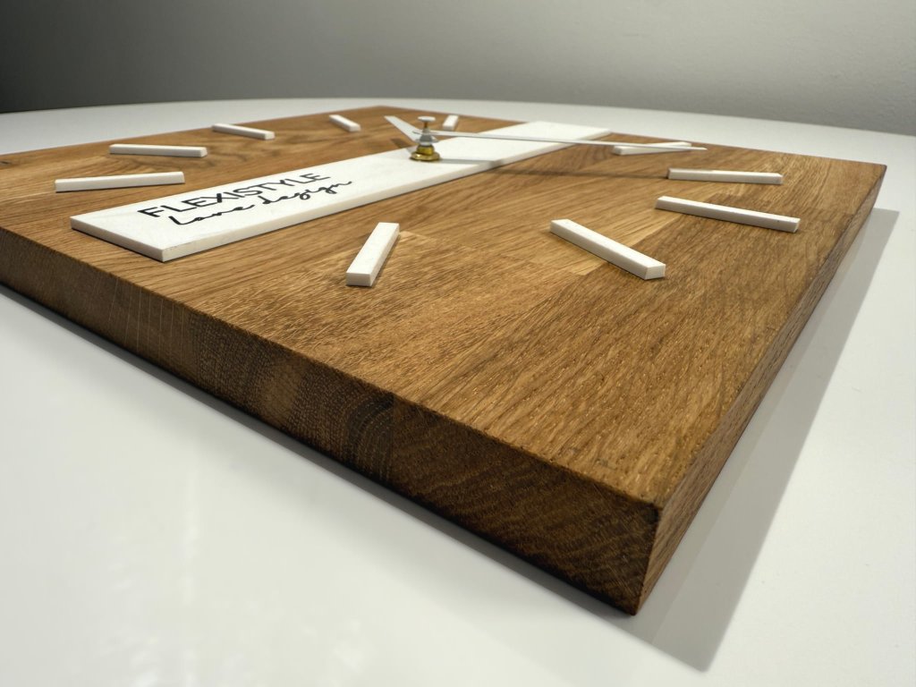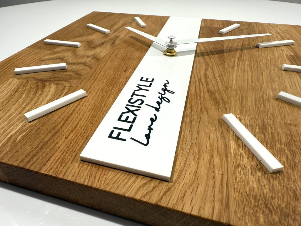 Každé hodiny v sebe spájajú prirodzenú krásu dubového dreva s moderným dizajnom. Dubové drevo bolo chránené ekologickým olejom, ktorý zvýrazňuje jeho štruktúru a zabezpečuje jeho trvanlivosť. Dekoratívne prvky sú vyrobené z matného plexiskla, ktoré celku dodáva eleganciu a ľahkosť.