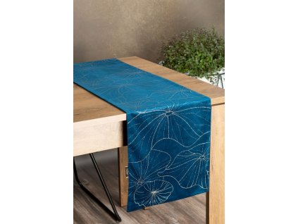 Elegantný behúň na stôl je vyrobený z mäkkej a na dotyk príjemnej zamatovej látky, zdobený potlačou jemných lístkov lekna sa bude skvele vynímať v modernom interiéri.