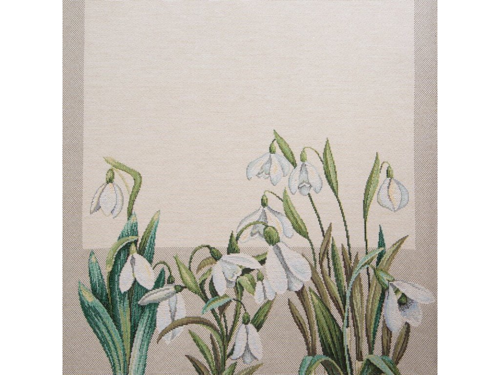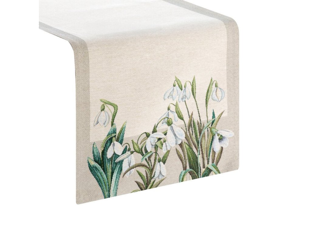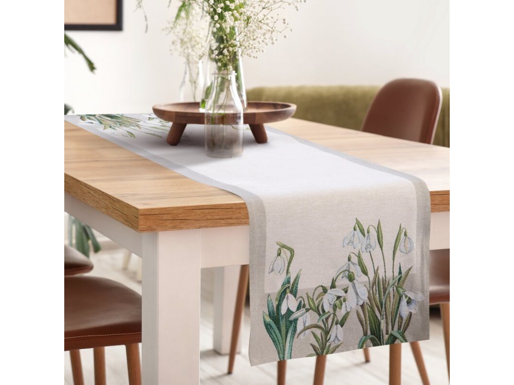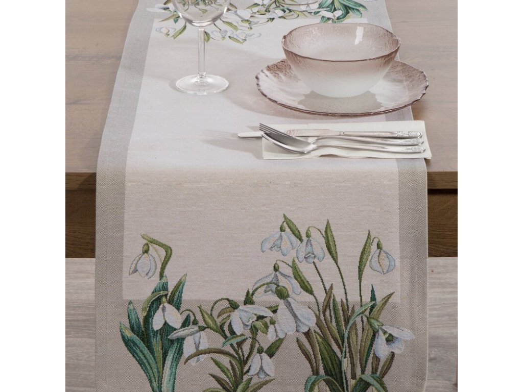 Jemný a elegantný gobelínový behúň na stôl s motívom snežienok vnesie do interiéru pocit jari, sviežosti a prírodnej harmónie.