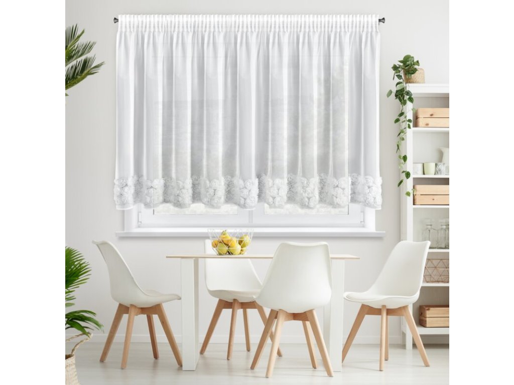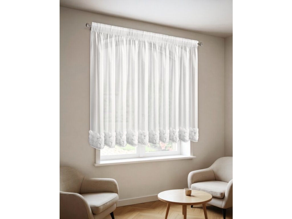 Záclonu zdobia tri horizontálne pásy 3D látkových ruží, ktoré vytvárajú nádherný dekoratívny efekt a dodávajú interiéru romantický, ženský nádych. Kombinácia jemného voálu a zmyselných detailov z nej robí ideálny doplnok do spálne, obývačky alebo jedálne, kde vytvorí atmosféru harmónie a elegancie.