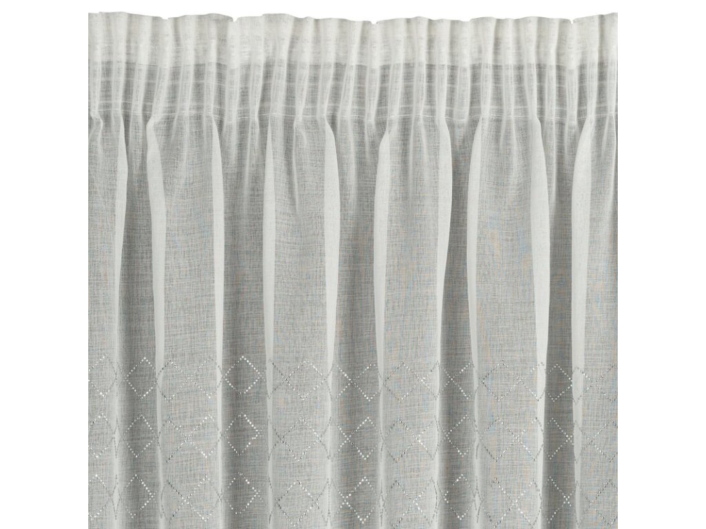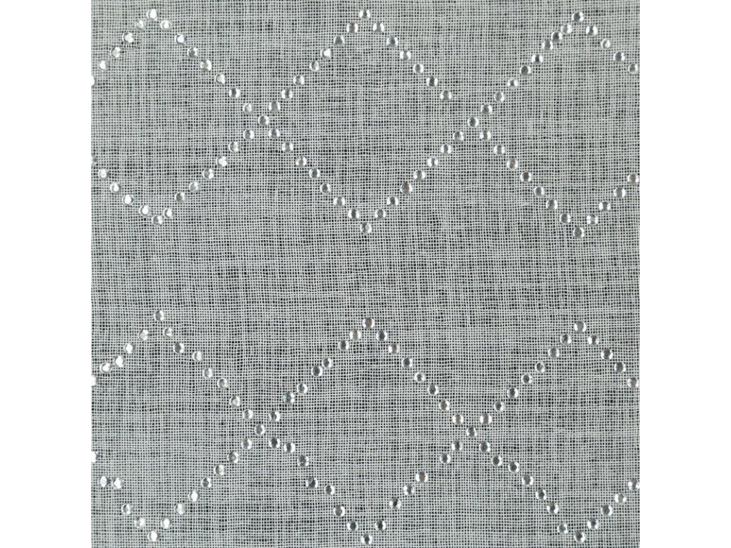 Záclona je vyrobená z jemného etamínu a krásne sa prikrýva na okno a vytvára jemný a príjemný efekt. Horná časť závesu je zdobená pásom lesklých kryštálov, ktoré sú usporiadané v geometrickom vzore, čo dodáva jeho jedinečnému šarmu a štýlu.