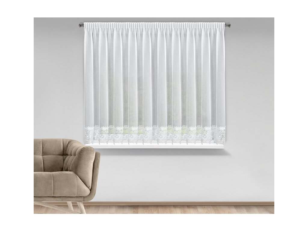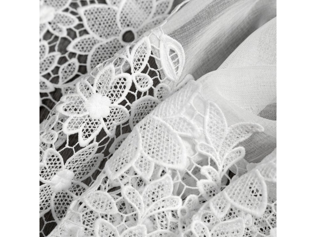 Ľahká, vzdušná látka v kombinácii s dekoratívnym čipkovým pásom vytvára harmonický celok, ktorý do interiéru prináša svetlo, ľahkosť a sofistikovaný detail. Transparentný materiál prepúšťa prirodzené denné svetlo, no zároveň zjemňuje pohľad do miestnosti a vytvára príjemnú atmosféru súkromia.
