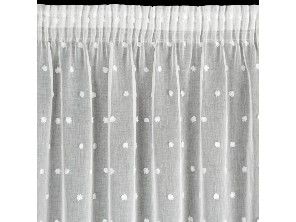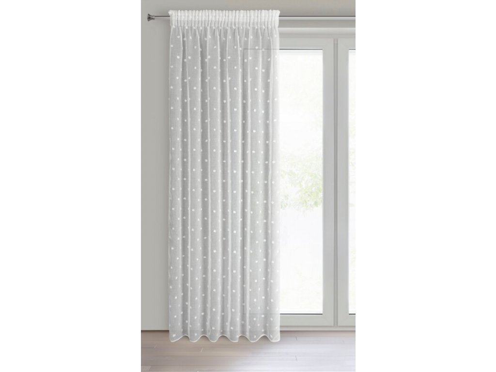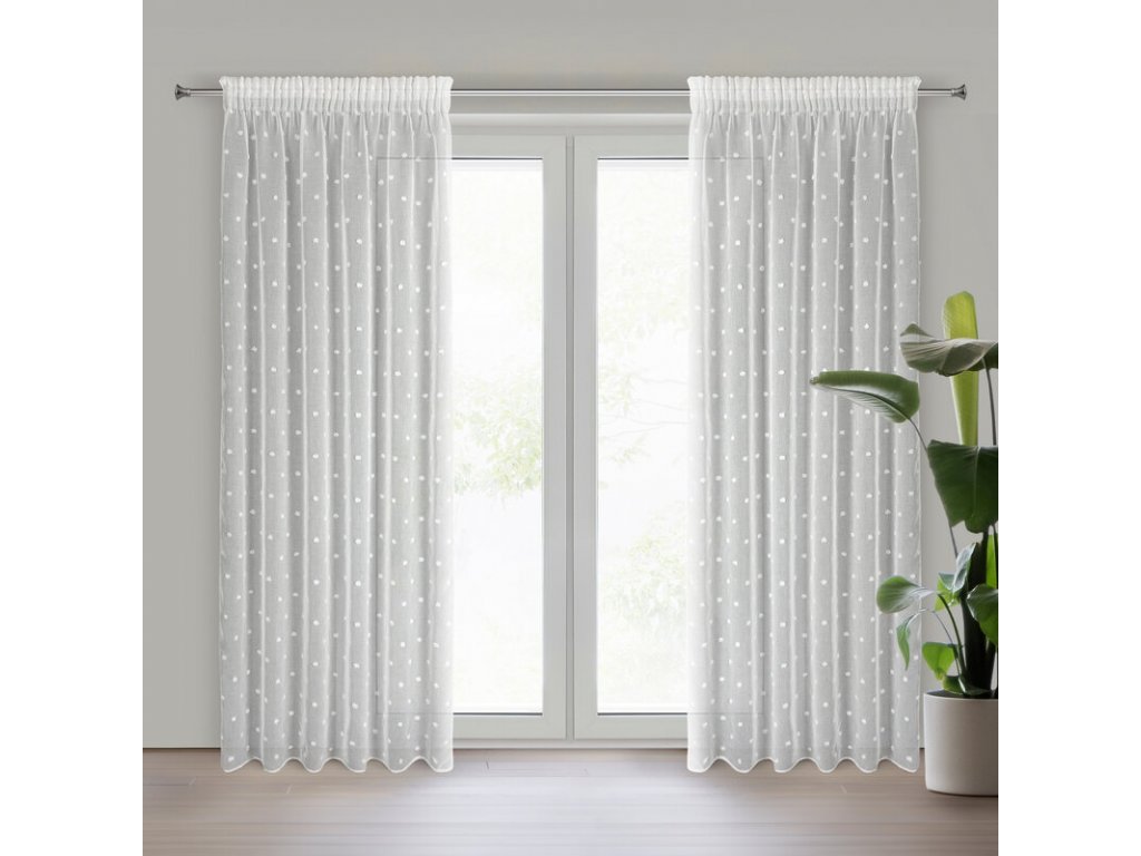 Jemné bodky na bielom podklade vytvárajú dokonalú rovnováhu medzi moderným a tradičným dizajnom, vďaka čomu je záclona vhodná do rôznych typov interiérov.