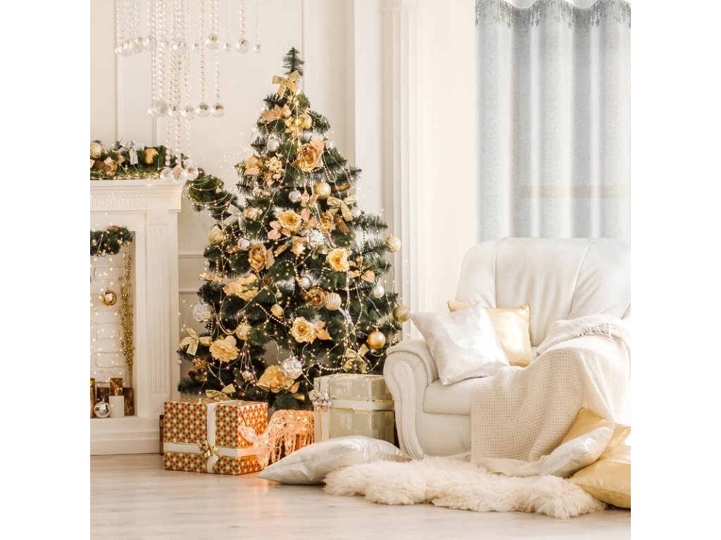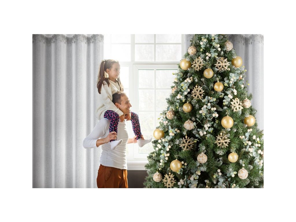 Hornú časť zdobí decentné strieborné vianočné lemovanie s jemnou výšivkou, ktoré pôsobí moderne, no zároveň luxusne. Metalické detaily sa elegantne trblietajú na svetle a dodávajú interiéru slávnostný, no vkusný charakter.