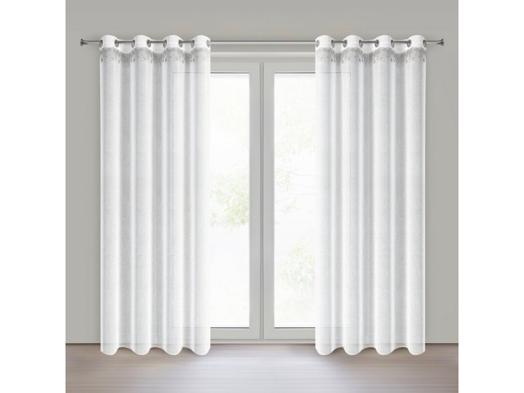 Záclona je hotová na zavesenie – v hornej časti je vybavená kovovými očkami, ktoré umožňujú jednoduché a rýchle uchytenie na záclonovú tyč. Látka sa prirodzene zavesí do jemných, rovnomerných záhybov a vytvorí elegantný a sviatočný vzhľad okna.