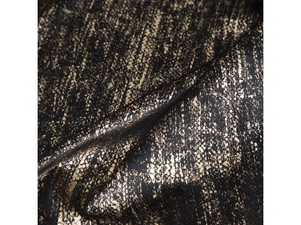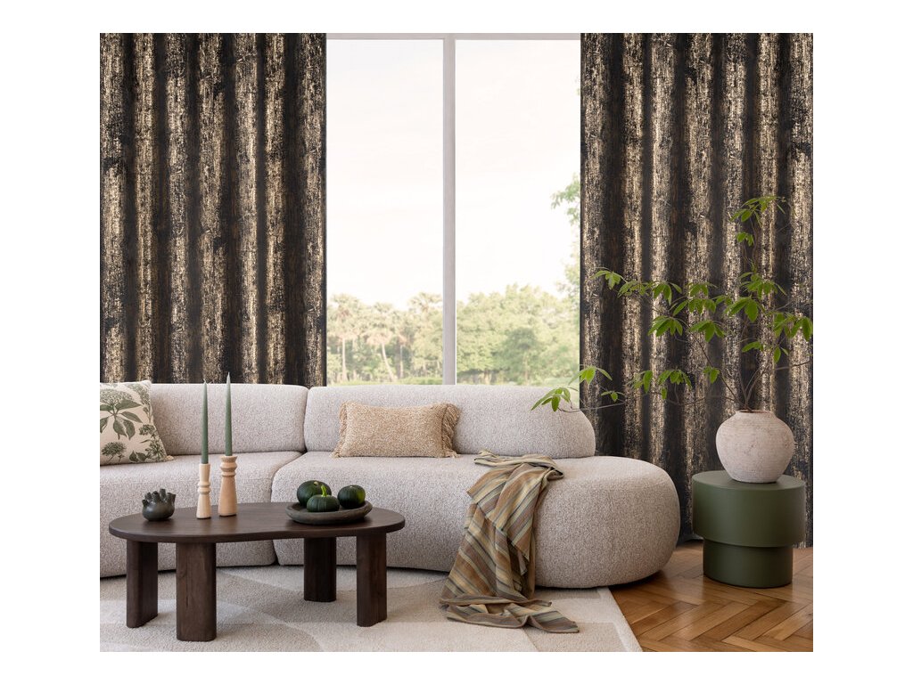 Zlaté vzory elegantne odrážajú svetlo, vďaka čomu záves pôsobí žiarivo a vytvára útulnú, náladovú atmosféru počas dňa aj večera. Vďaka praktickým zlatým kovovým očkám sa záves jednoducho zavesí a ľahko posúva po tyči – látka sa prirodzene tvaruje do mäkkých, rovnomerných záhybov.