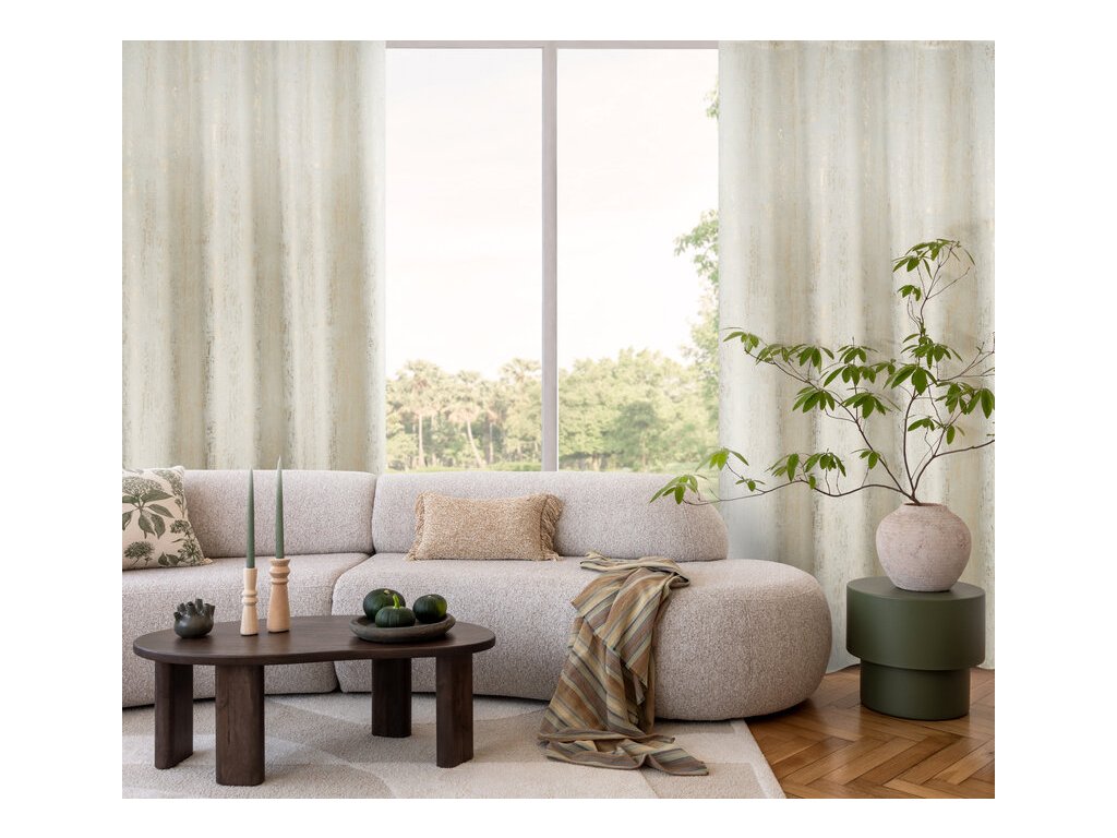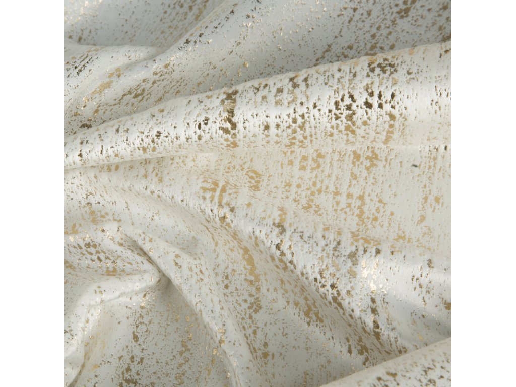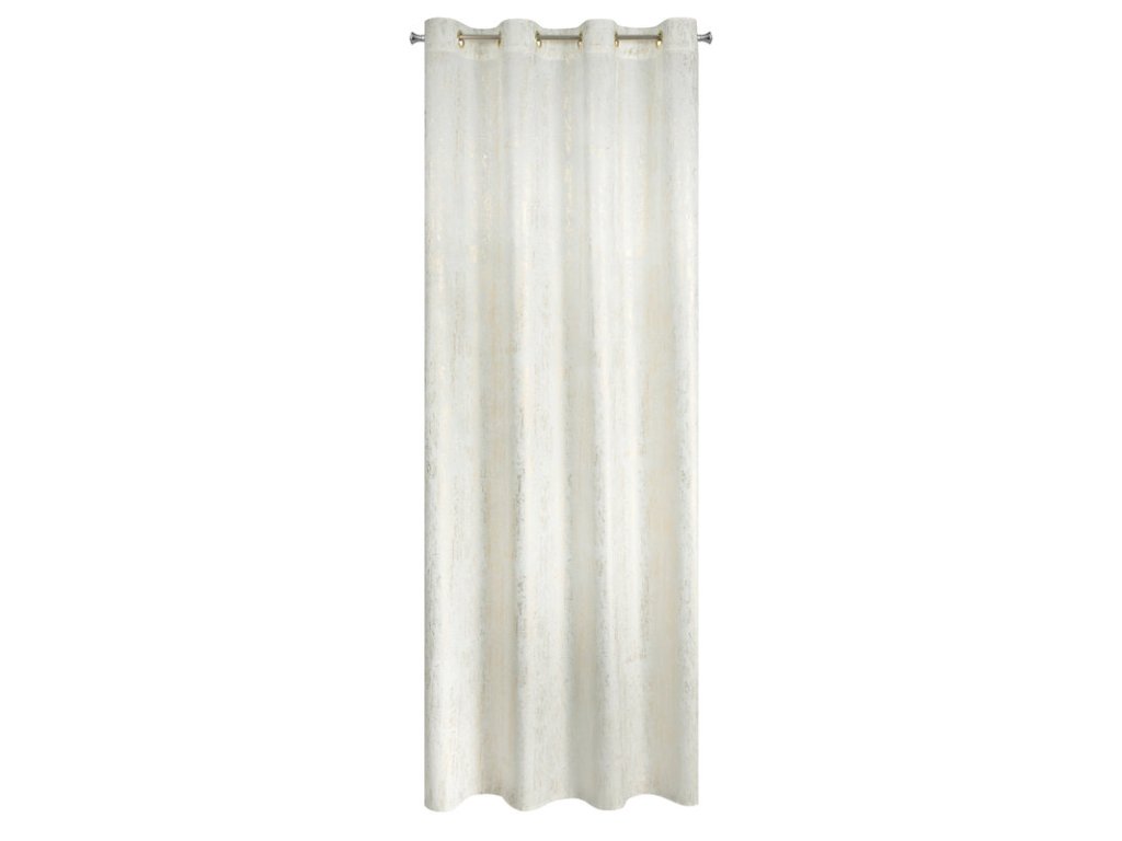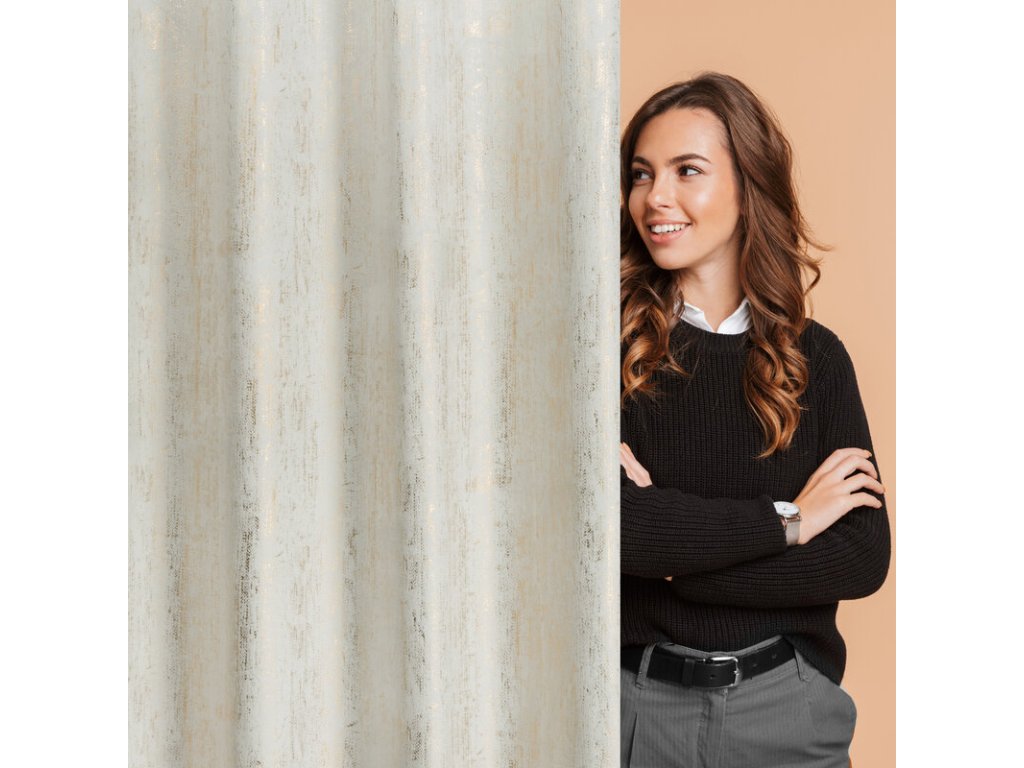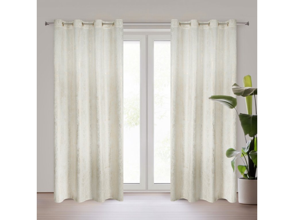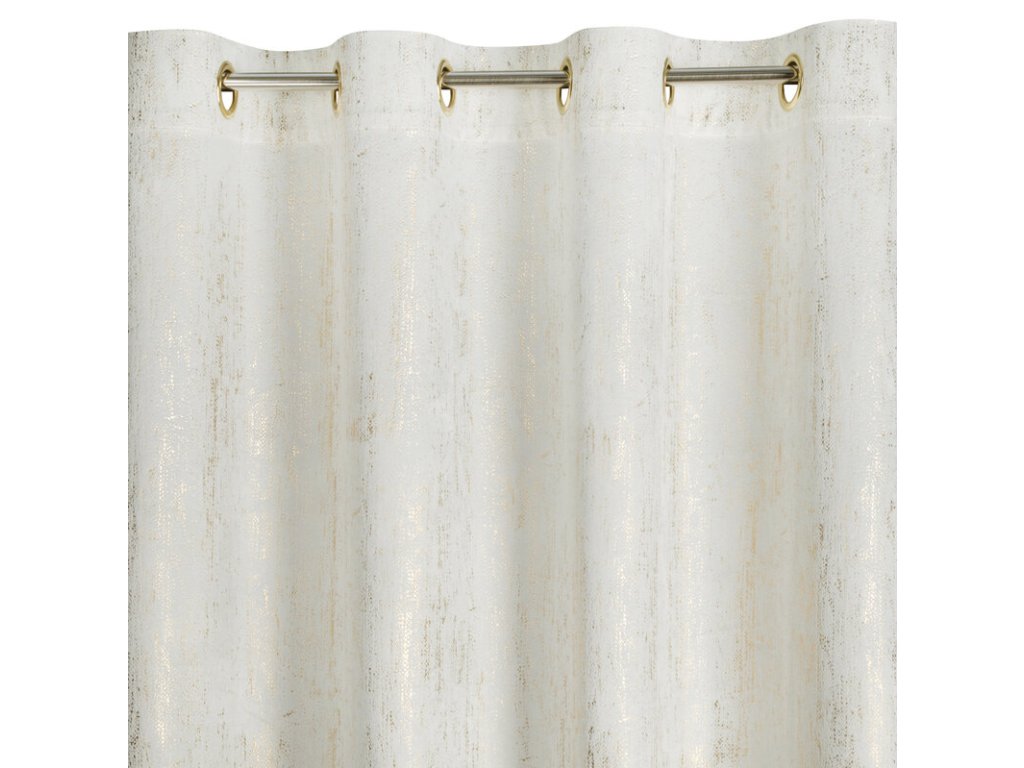 Zlaté vzory elegantne odrážajú svetlo, vďaka čomu záves pôsobí žiarivo a vytvára útulnú, náladovú atmosféru počas dňa aj večera. Vďaka praktickým zlatým kovovým očkám sa záves jednoducho zavesí a ľahko posúva po tyči – látka sa prirodzene tvaruje do mäkkých, rovnomerných záhybov.