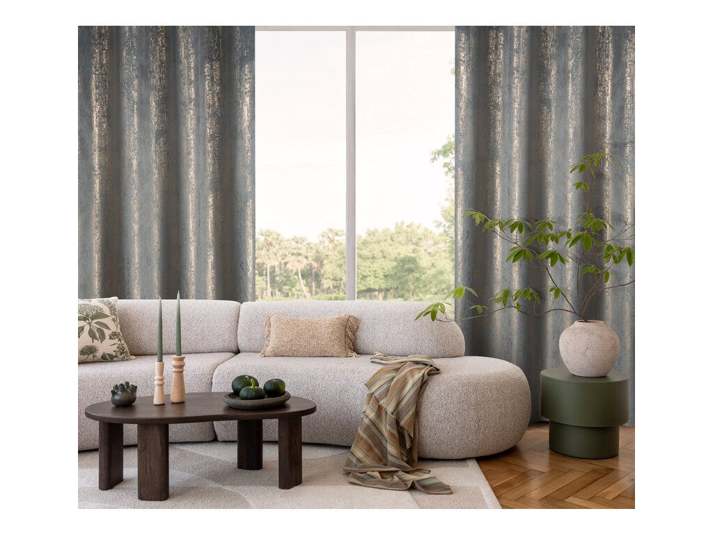 Zlaté vzory elegantne odrážajú svetlo, vďaka čomu záves pôsobí žiarivo a vytvára útulnú, náladovú atmosféru počas dňa aj večera. Vďaka praktickým zlatým kovovým očkám sa záves jednoducho zavesí a ľahko posúva po tyči – látka sa prirodzene tvaruje do mäkkých, rovnomerných záhybov.