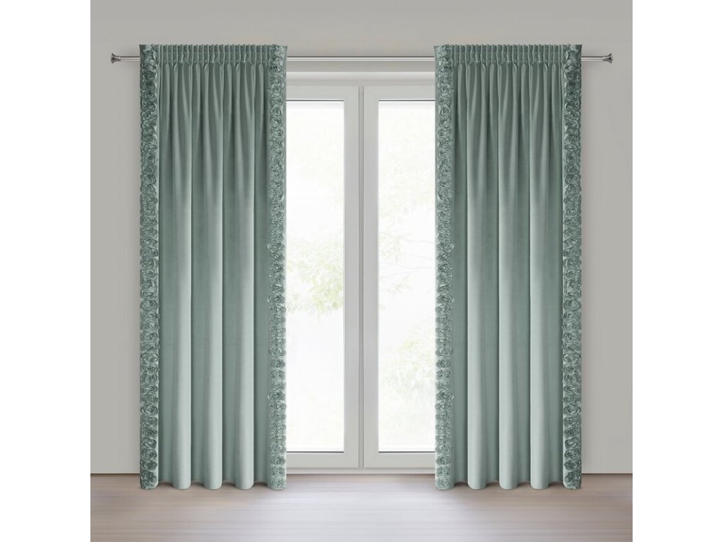 Zútulnite svoj interiér sviežou a elegantnou farbou s týmto hotovým zamatovým závesom s ozdobnými pruhmi ruží po stranách v krásnom mentolovom odtieni. Tento záves spája luxusný vzhľad, jemnosť a funkčnosť – ideálny doplnok pre tých, ktorí si potrpia na štýl a kvalitu.