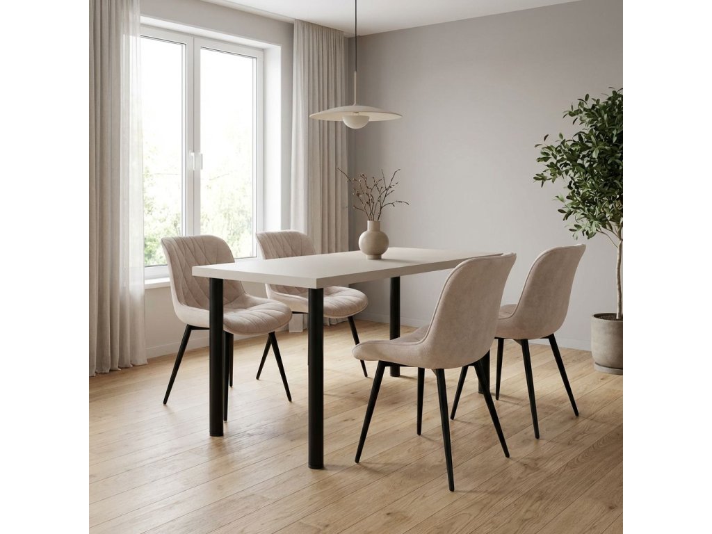 K stoličke sa krásne hodia jednoduché doplnky s čistými líniami – napríklad jednofarebný behúň na stôl a závesy v neutrálnej palete. Pri stole vytvorí elegantný kontrast aj tmavšie osvetlenie alebo čierne detaily.
