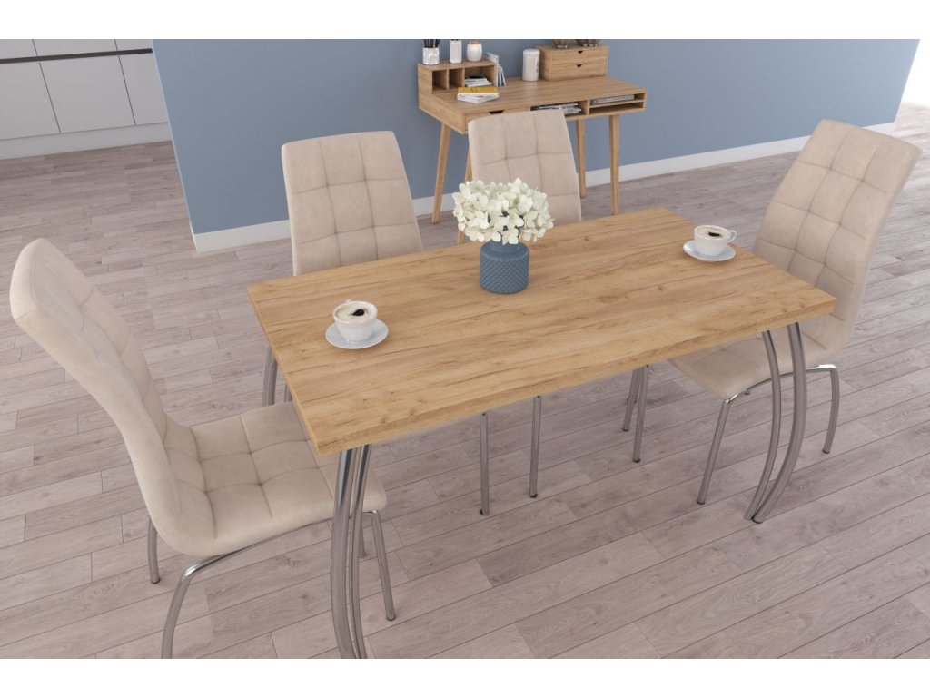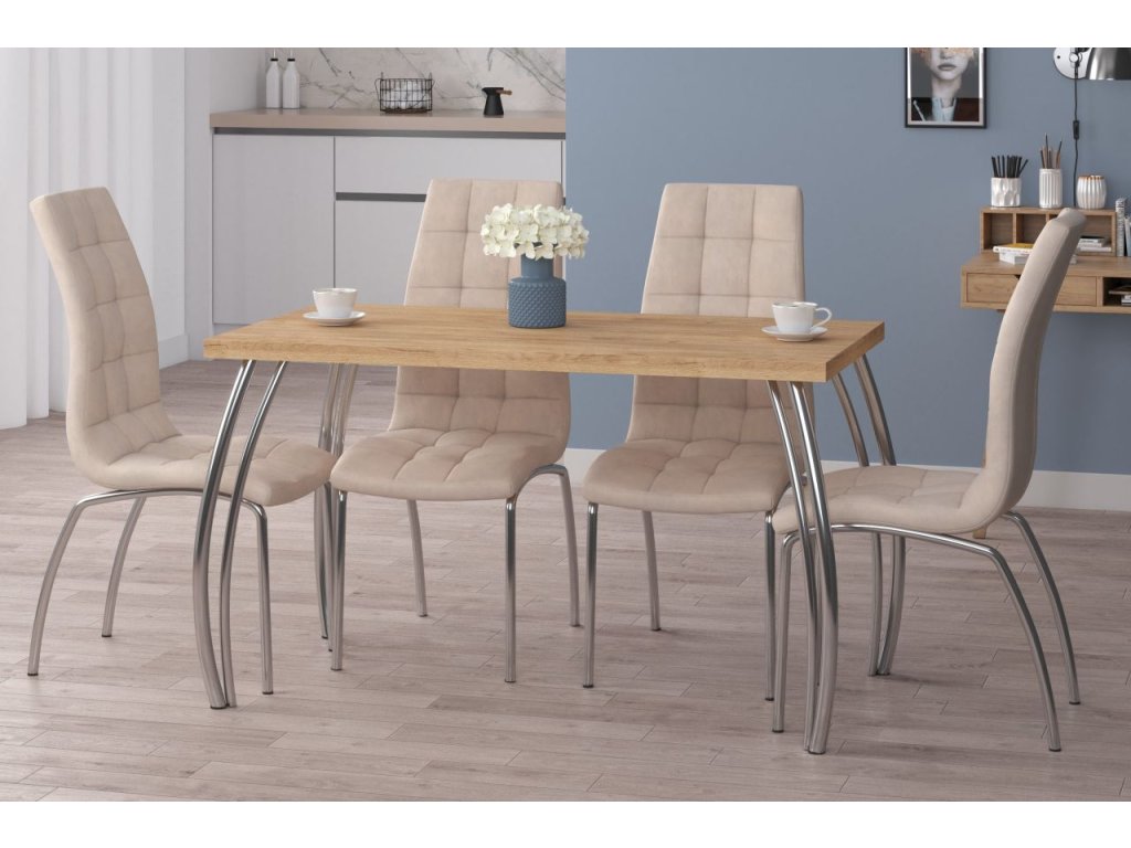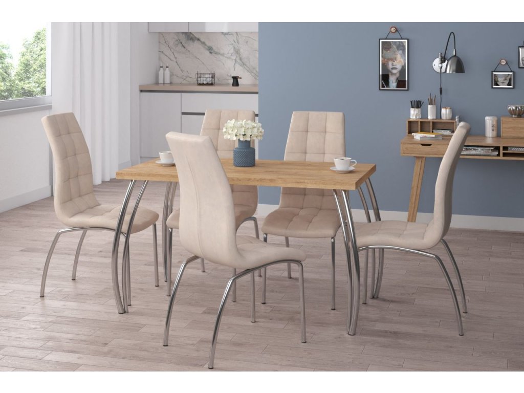 Moderný jedálenský stôl s doskou v atraktívnom dekore dub zlatý craft a elegantnými chrómovými nohami. Kombinácia prirodzeného vzhľadu dreva s moderným kovom vytvorí štýlový akcent v každej jedálni alebo kuchyni. Laminovaná doska je praktická a odolná voči každodennému používaniu.