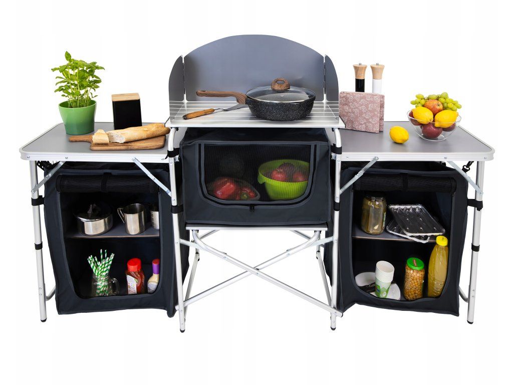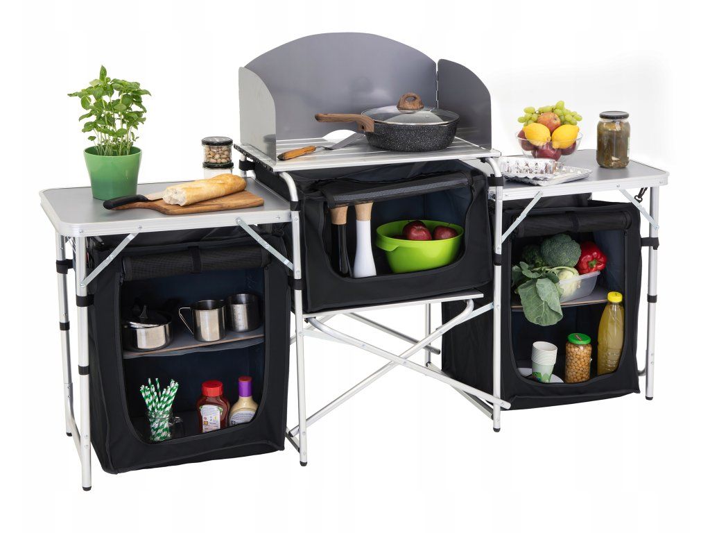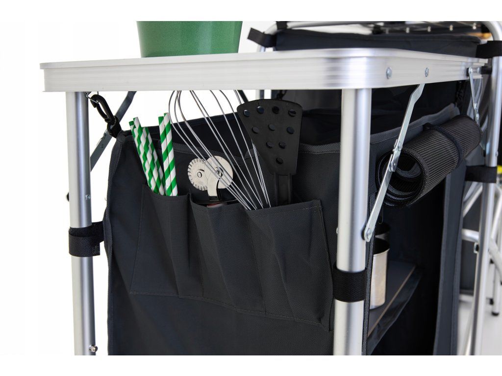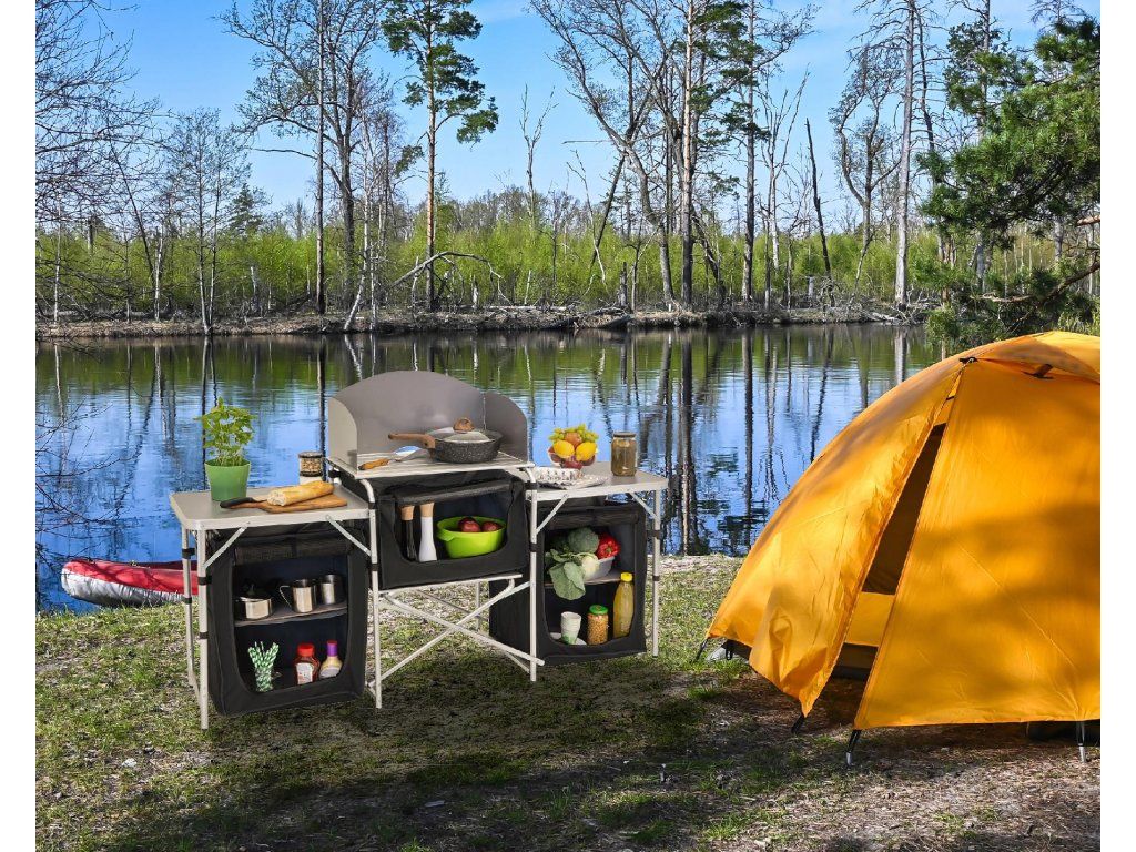 Predstavte si tábornícky večer, keď máte všetko poruke – varič stabilne umiestnený na kovovej pracovnej doske, riad prehľadne uložený v závesných priehradkách a po skončení varenia celú kuchyňu zloženú do jednej tašky.