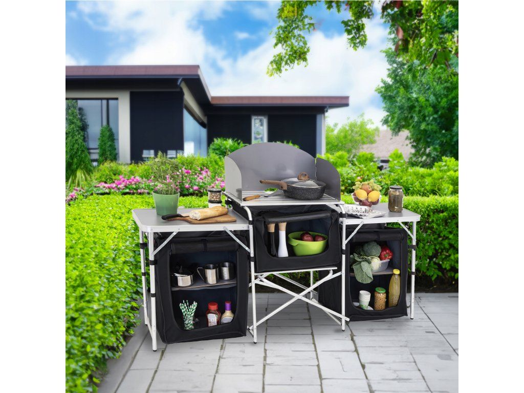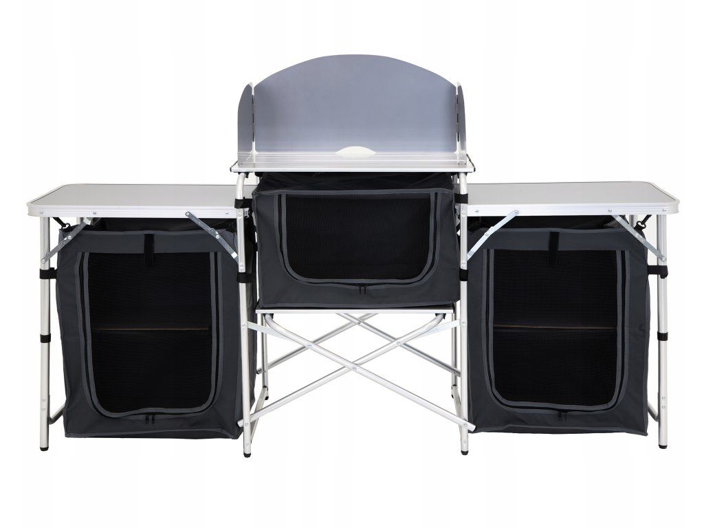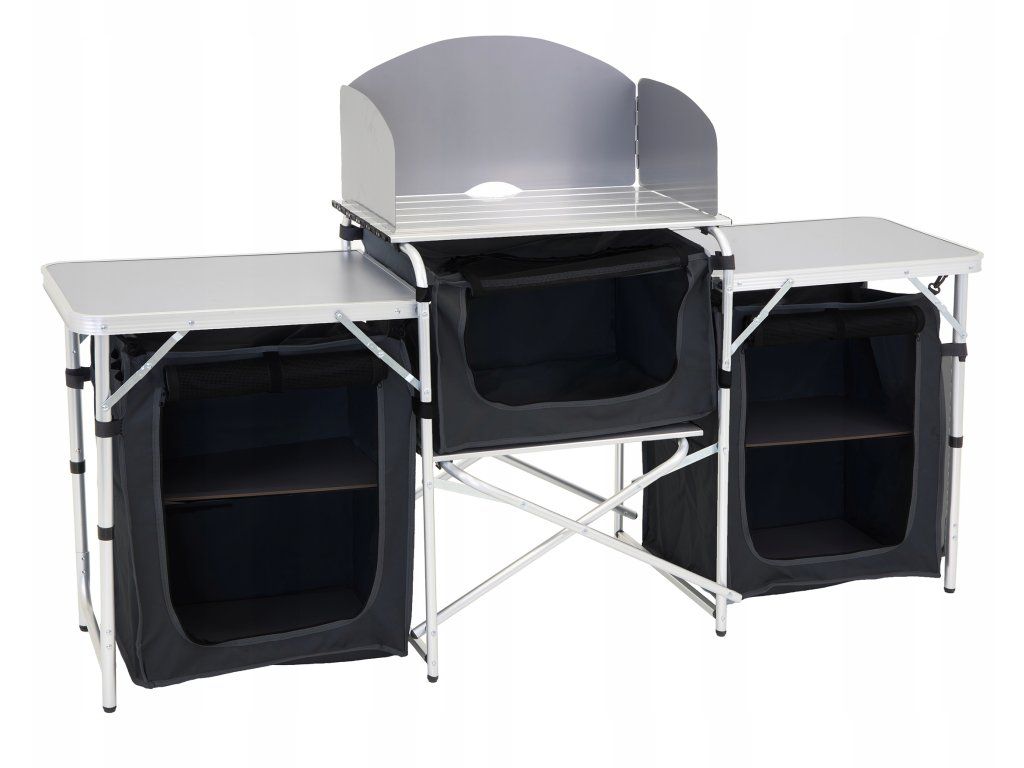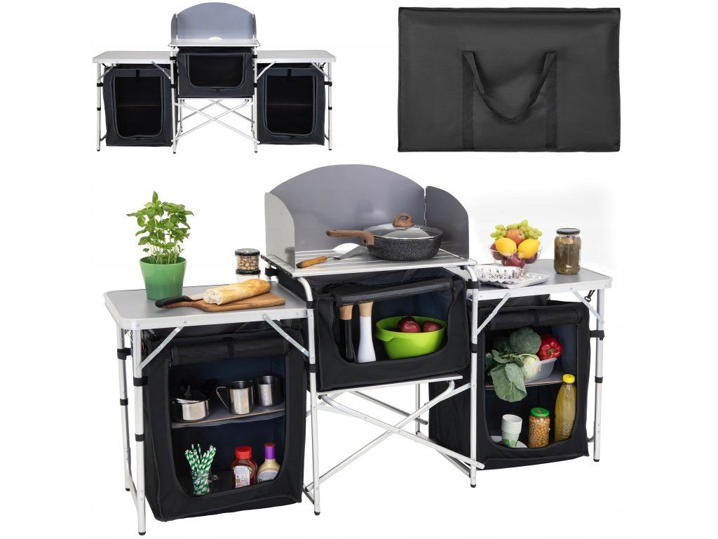Predstavte si tábornícky večer, keď máte všetko poruke – varič stabilne umiestnený na kovovej pracovnej doske, riad prehľadne uložený v závesných priehradkách a po skončení varenia celú kuchyňu zloženú do jednej tašky.