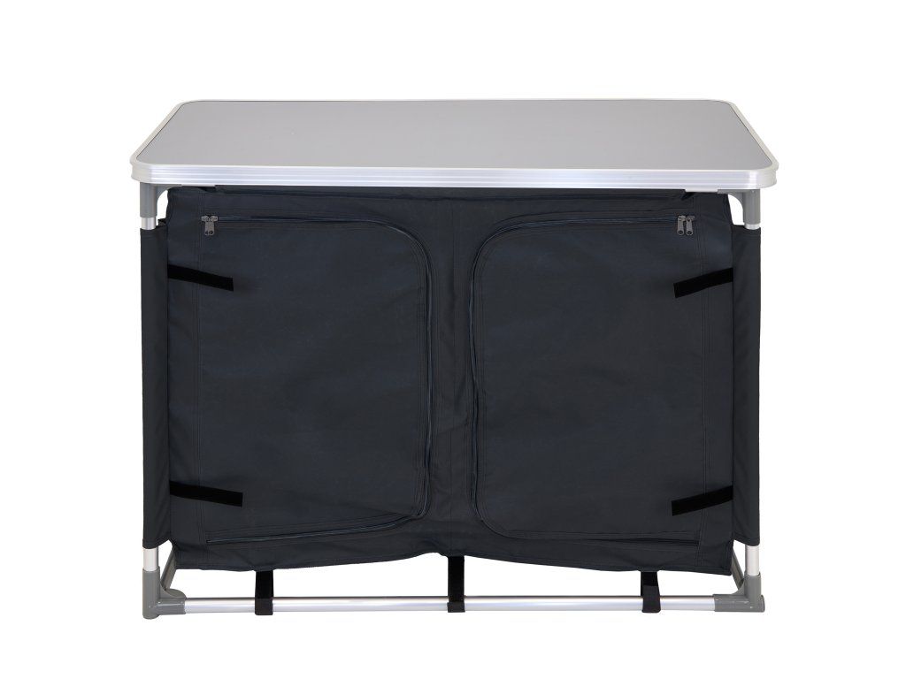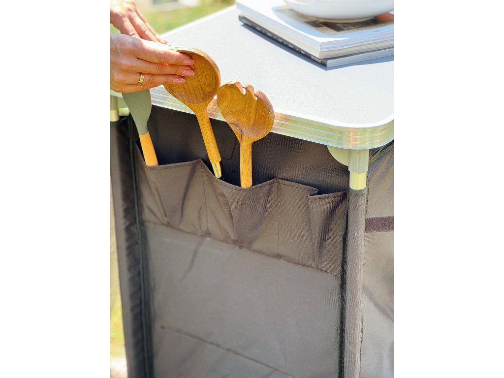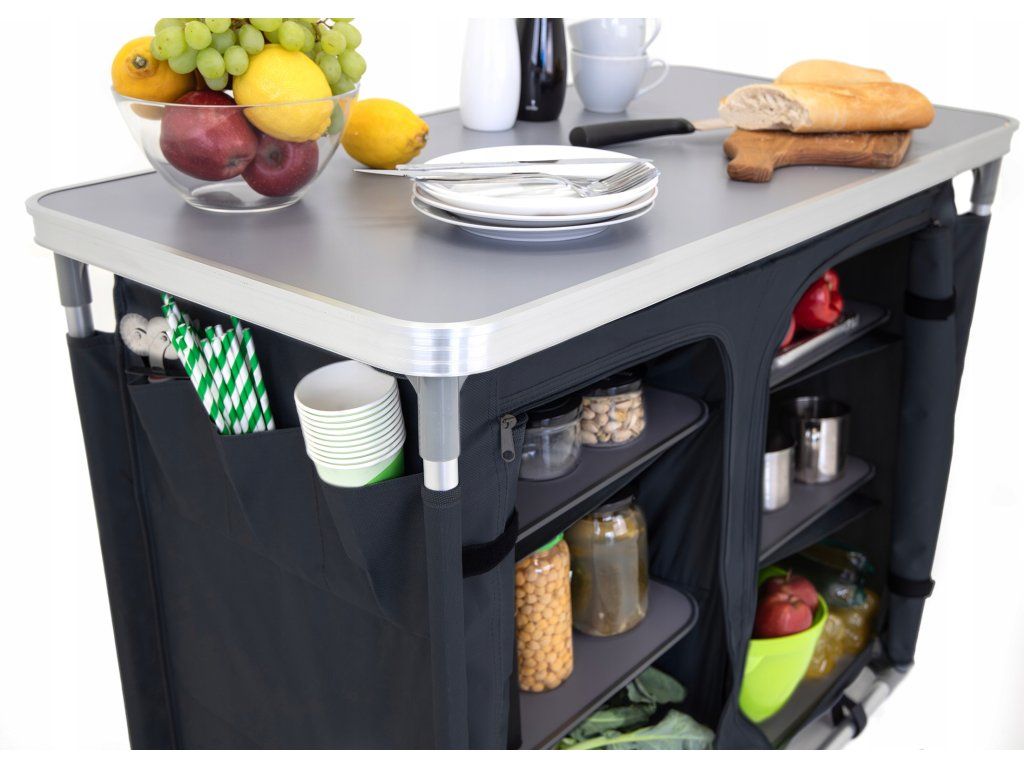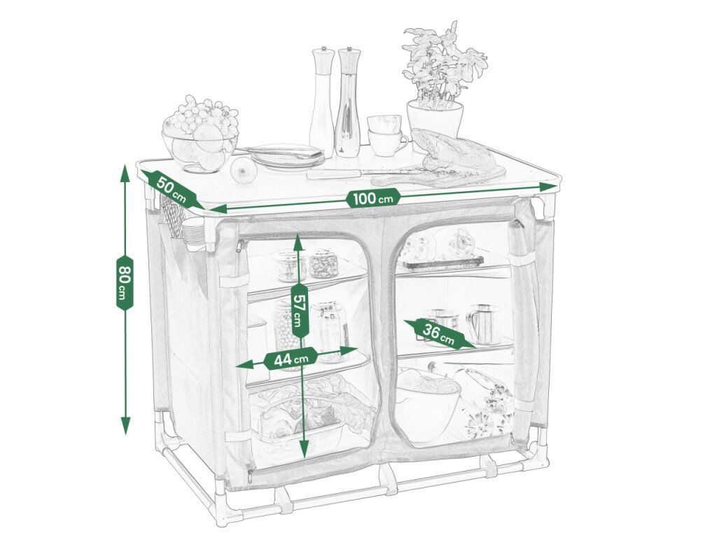 Spodná časť so zatvárateľným textilným úložným priestorom pomáha chrániť obsah pred prachom a nečistotami, pričom police vo vnútri ponúkajú dostatok miesta na organizované uloženie kuchynských potrieb, potravín či doplnkov na kempovanie.