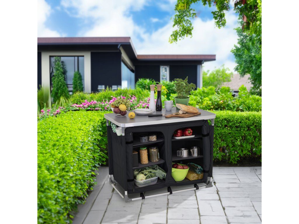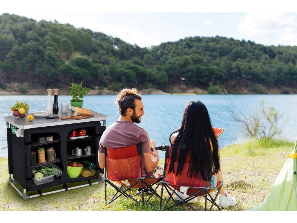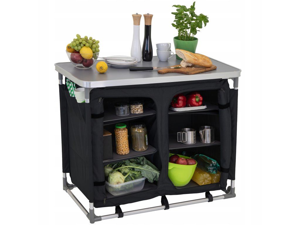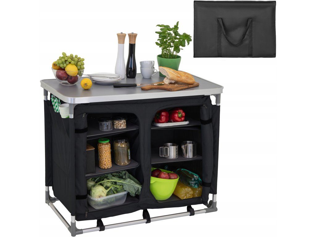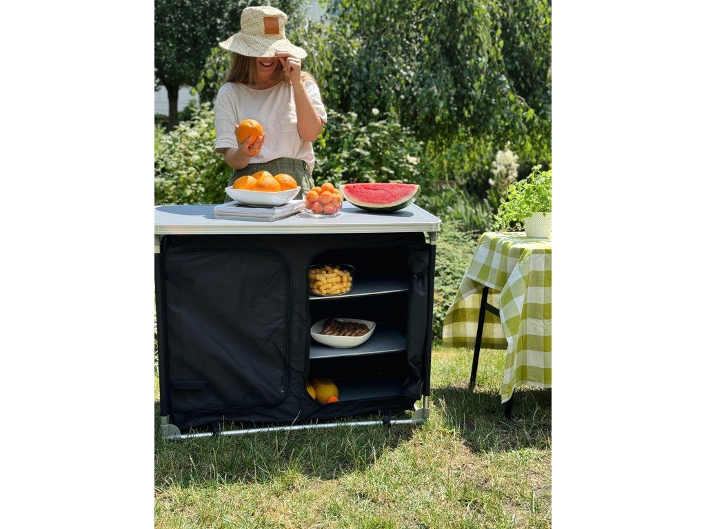Kempingová skladacia skrinka so stolíkom v čiernej farbe je praktickým riešením pre každého, kto chce mať potraviny, riad aj drobné vybavenie prehľadne usporiadané a zároveň po ruke.