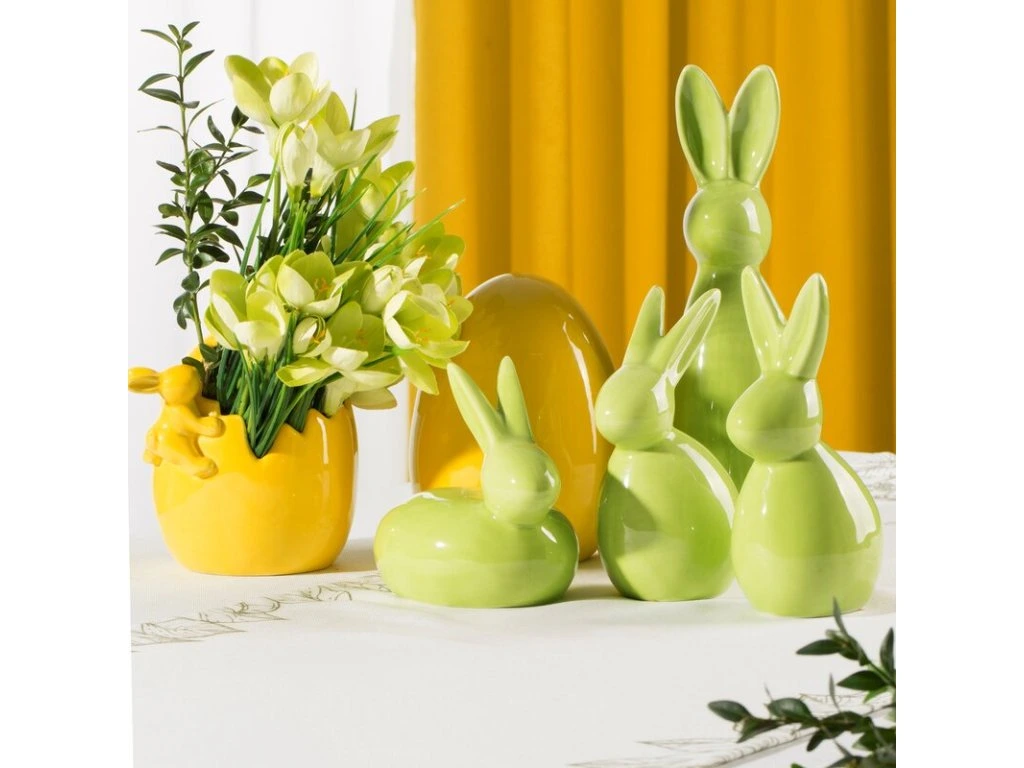 Na rozdiel od plastových alternatív zostáva keramický povrch nepoškodený, lesklý a ľahko sa čistí. Kombinácia tradičného tvaru a trendových farieb umožňuje túto figúrku bez námahy ladiť s ďalšími jarnými dekoráciami v obývačke, jedálni aj v predsieni. Vďaka kompaktným rozmerom 9x9x10 cm je vhodná do akéhokoľvek priestoru a nepreťažuje policu či parapet.