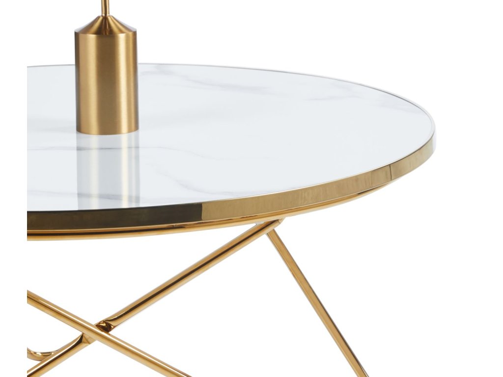 Stolík má okrúhly akrylový vrch v prevedení biely mramor, ktorý je odolný, ľahko sa čistí a pôsobí mimoriadne esteticky. Stabilná podstava zo zlatého chrómovaného kovu vytvára geometrickú konštrukciu, ktorá dodáva stolíku luxusný a jedinečný vzhľad.