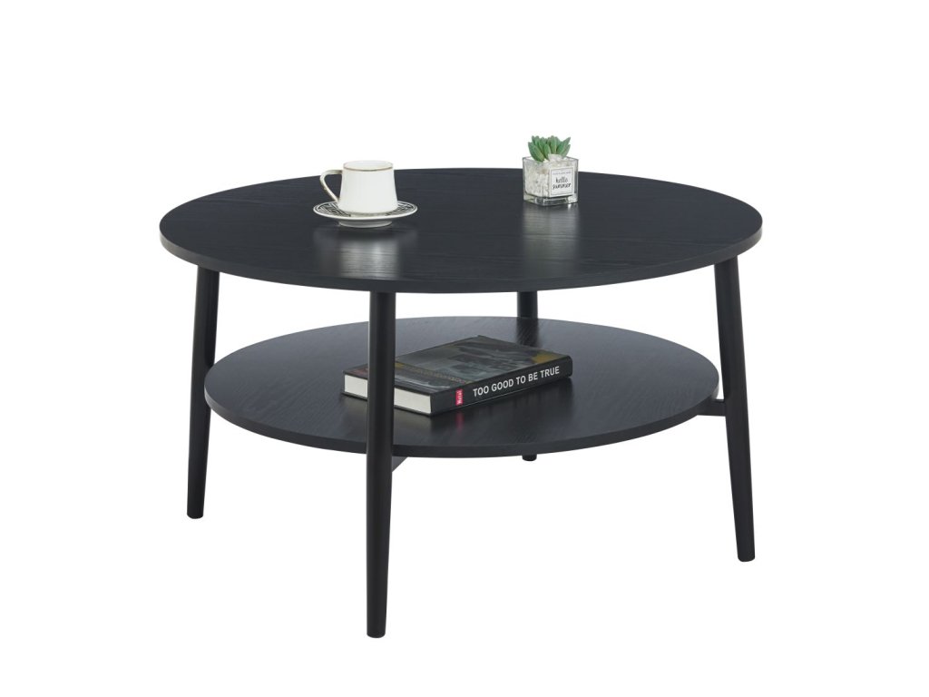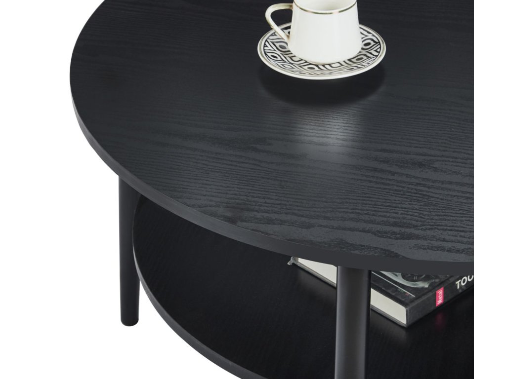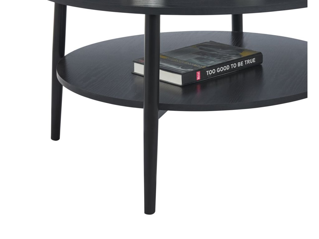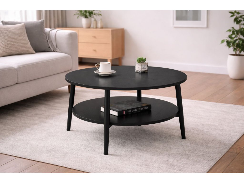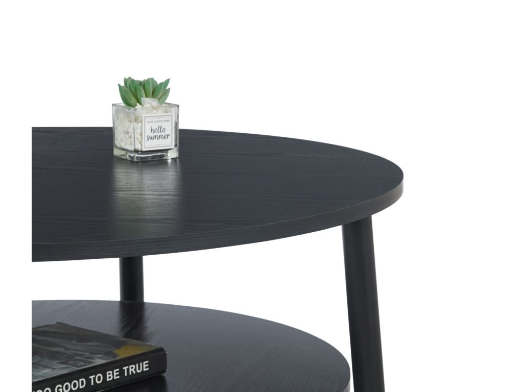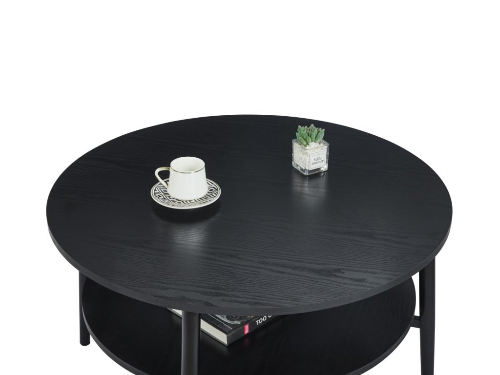 Horná aj spodná doska poskytujú dostatok priestoru na každodenné používanie – od odkladania nápojov a dekorácií až po knihy či časopisy. Pevné kovové nohy s matnou povrchovou úpravou zabezpečujú výbornú stabilitu, odolnosť a dlhú životnosť. Vďaka okrúhlemu tvaru stolík pôsobí vzdušne a je ideálny aj do menších obývačiek.