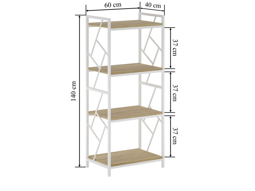S rozmermi 60 x 40 x 139,5 cm ponúka regál štvorica priestranných políc pre knihy, dekorácie, úložné boxy či iné predmety. Hĺbka 40 cm zabezpečuje dostatočné miesto pre väčšie predmety, zatiaľ čo šírka 60 cm umožňuje efektívne využitie priestoru. Výška takmer 140 cm poskytuje výraznú úložnú kapacitu bez nadmerného zaberania podlahovej plochy.