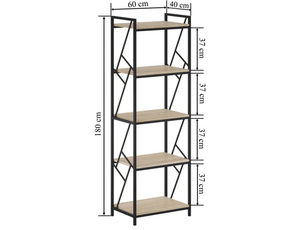 S rozmermi 60x40x180 cm poskytuje regál dostatok úložného priestoru na 5 policach. Kompaktná hĺbka 40 cm umožňuje umiestnenie aj do menších priestorov, zatiaľ čo výška 180 cm maximálne využíva vertikálny priestor. Laminovaná povrchová úprava políc je odolná voči poškriabaniu a ľahko sa udržuje.