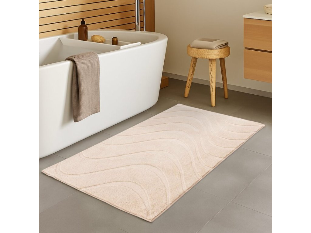 Ak hľadáte koberec, ktorý kombinuje luxus, hrejivý vzhľad, jemnú textúru a praktické použitie, béžový kúpeľňový koberec Waves je skvelou voľbou pre elegantný a pohodlný domov.