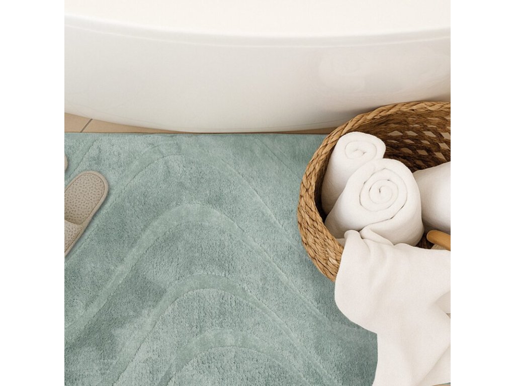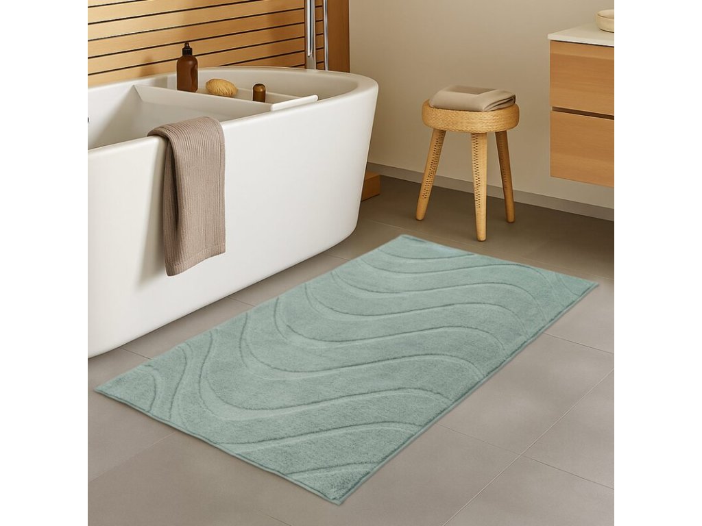 Šalviovozelený kúpeľňový koberec Waves prináša do kúpeľne sviežosť, pokoj a prírodnú eleganciu. Jeho výrazná 3D vlnová štruktúra vytvára jemný vizuálny pohyb, ktorý oživí priestor a dodá mu estetickú hĺbku. Šalviová zelená je veľmi obľúbená farba v modernom bývaní — pôsobí harmonicky, upokojujúco a dokonale sa kombinuje s bielymi, béžovými, drevenými aj tmavými prvkami kúpeľne.