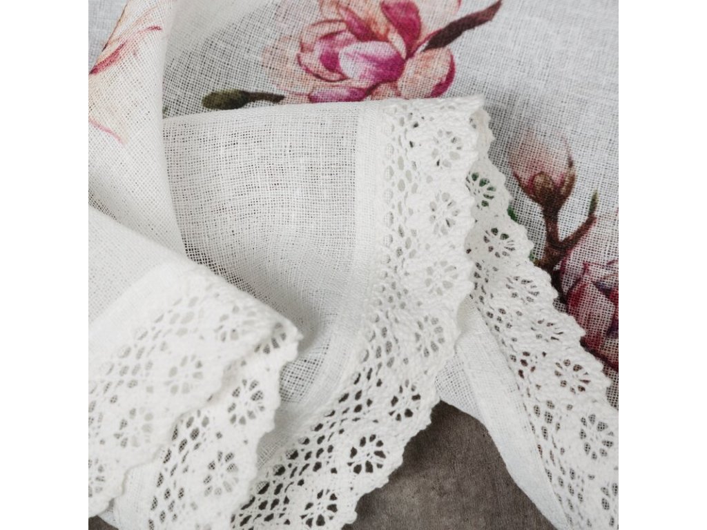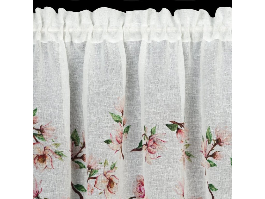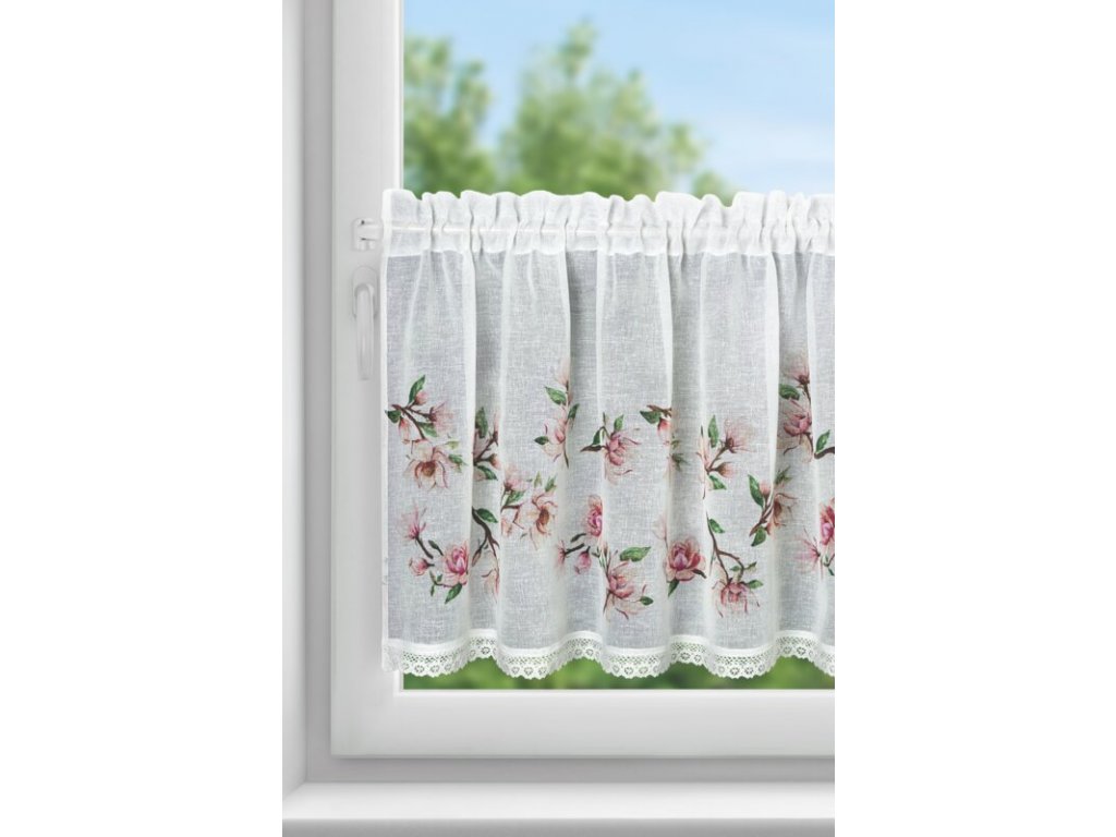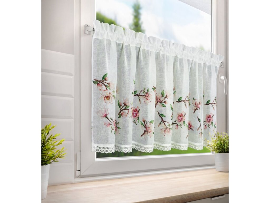 Presne o tú atmosféru vo vašej kuchyni sa postará malá záclonka ARI, ozdobená bavlnenou čipkou a potlačou ružových magnólií.