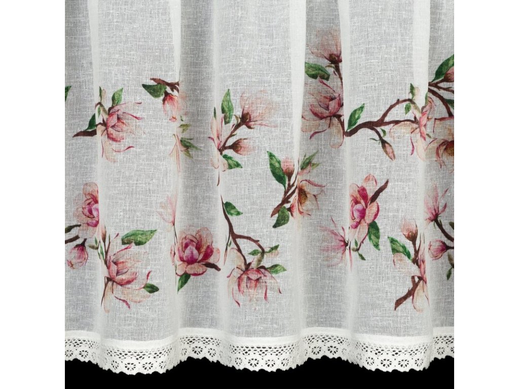 Kuchynská záclonka ARI zdobená potlačou magnólií a čipkou 150x60cm