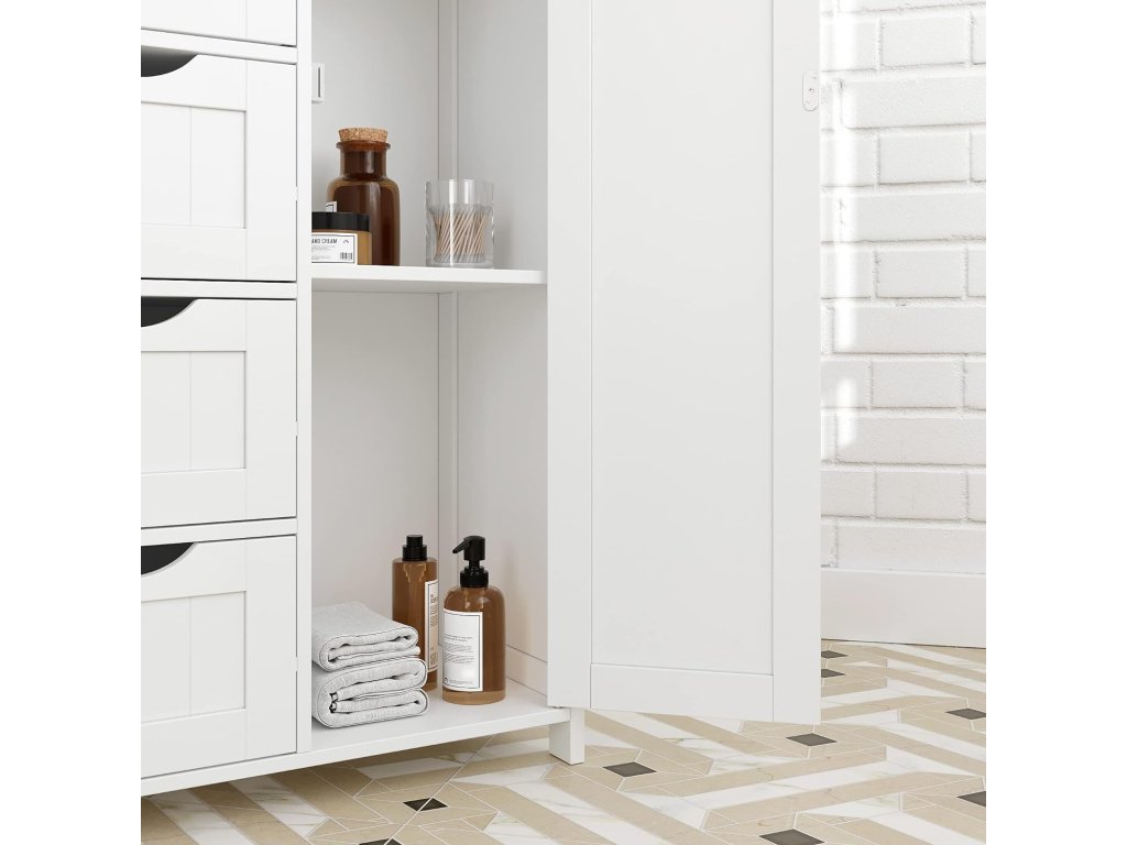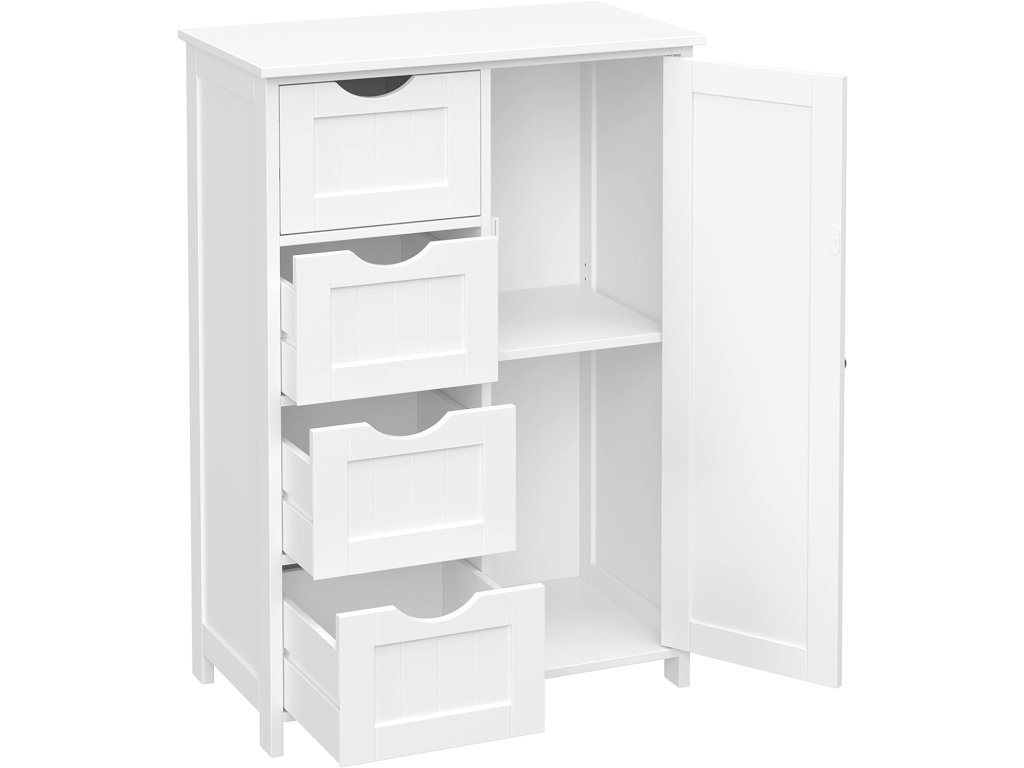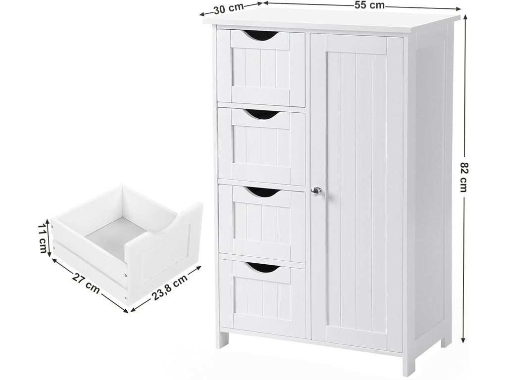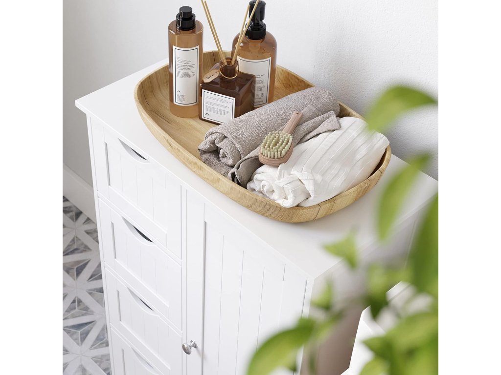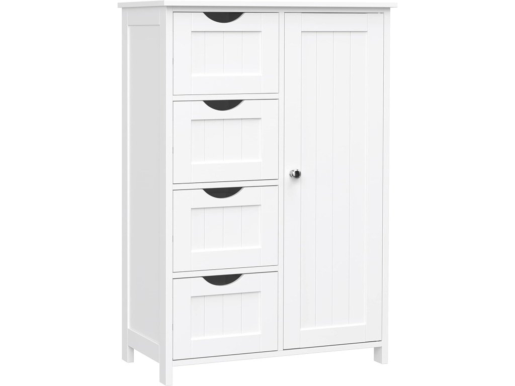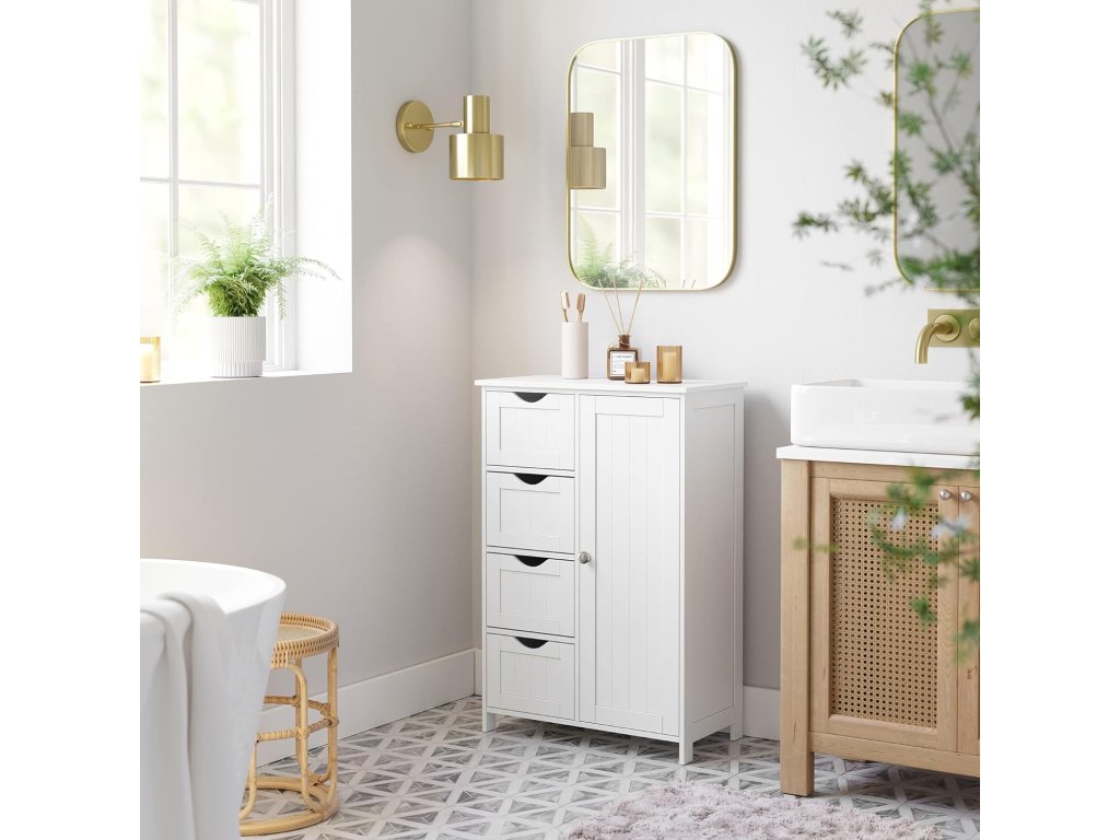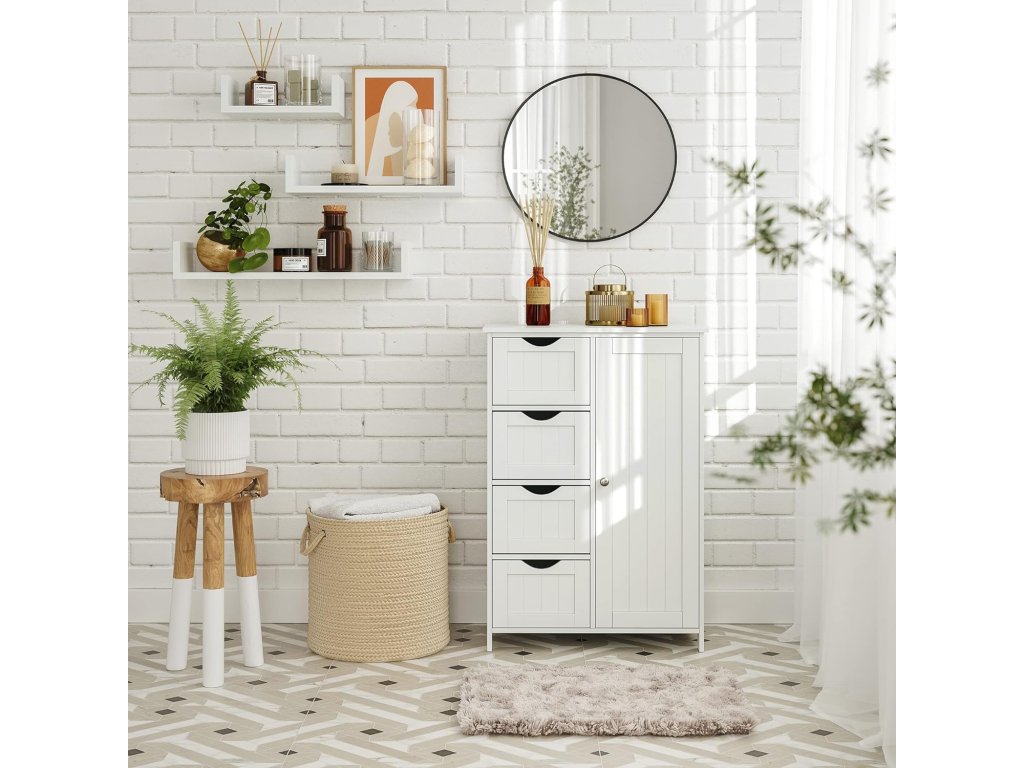 Elegantná kúpeľňová skrinka – komoda v bielej farbe je praktickým riešením pre každého, kto chce mať v kúpeľni poriadok a zároveň zachovať čistý, moderný vzhľad interiéru. Vďaka kombinácii uzatvárateľného úložného priestoru a štyroch zásuviek poskytuje dostatok miesta na uloženie uterákov, kozmetiky, hygienických potrieb aj kúpeľňových doplnkov.