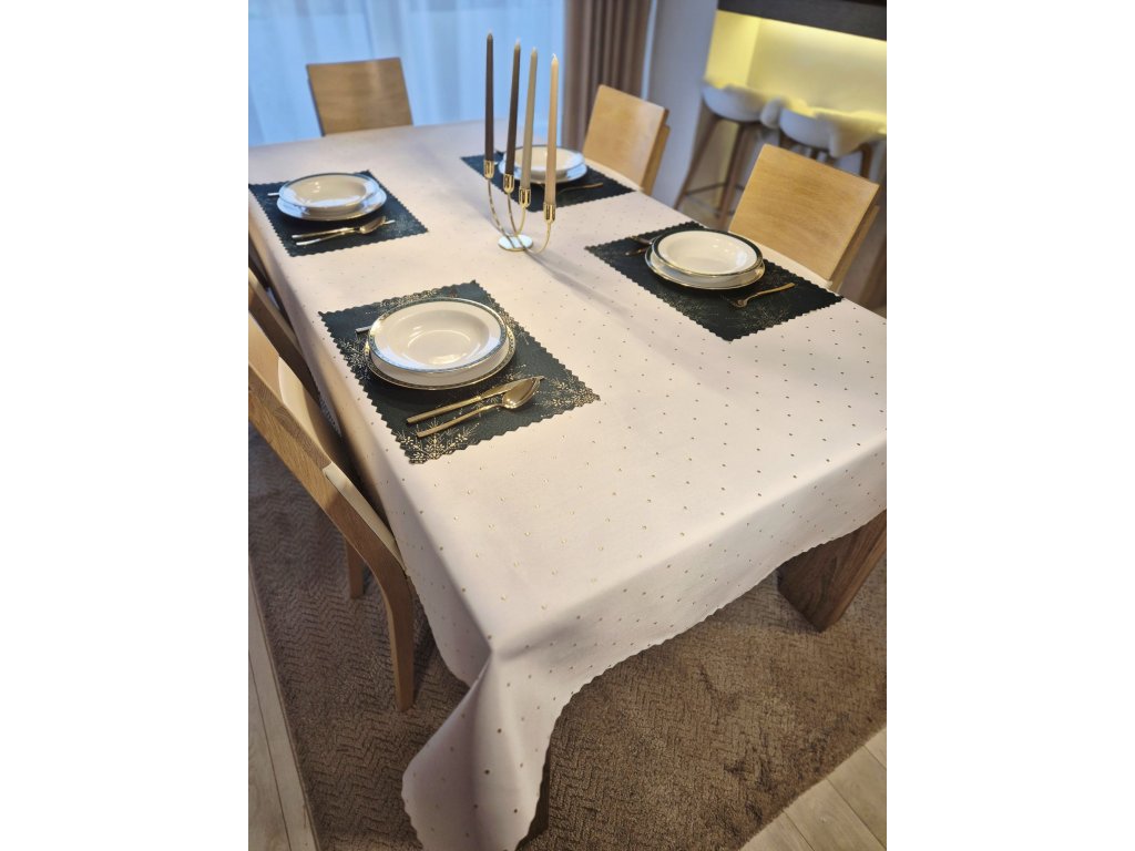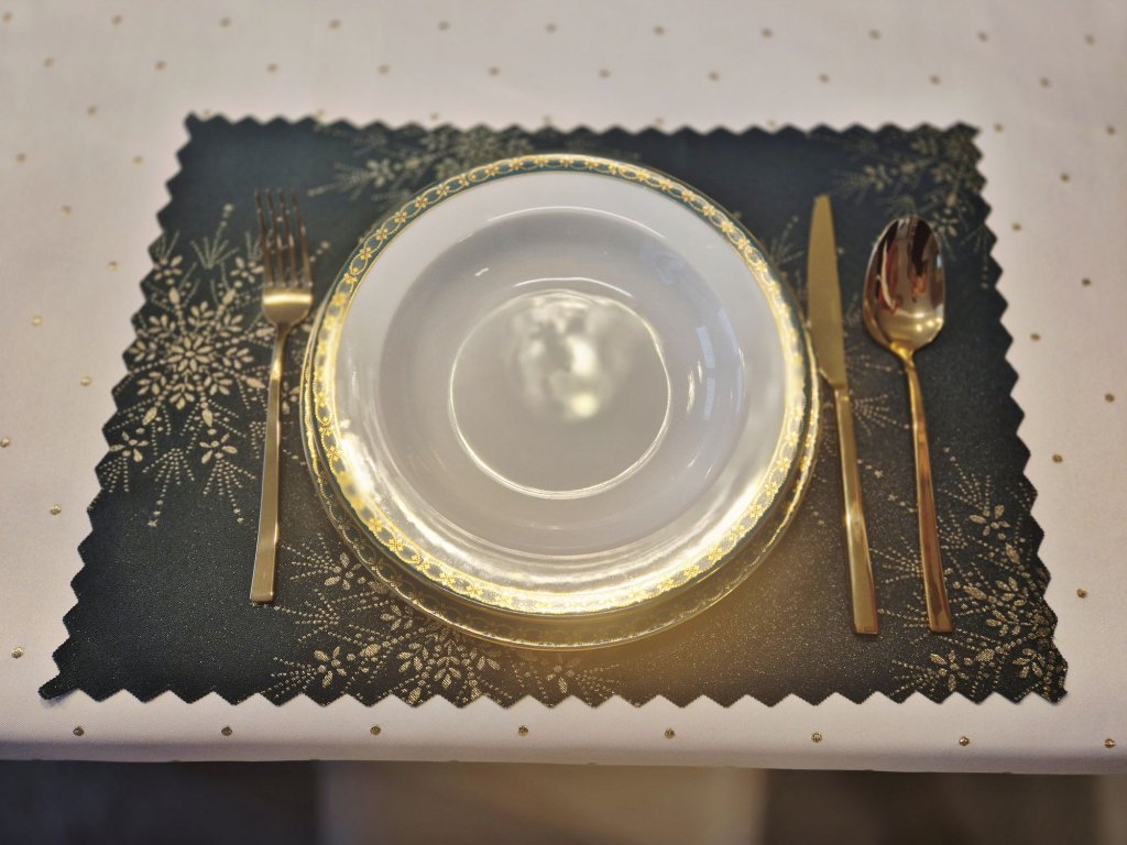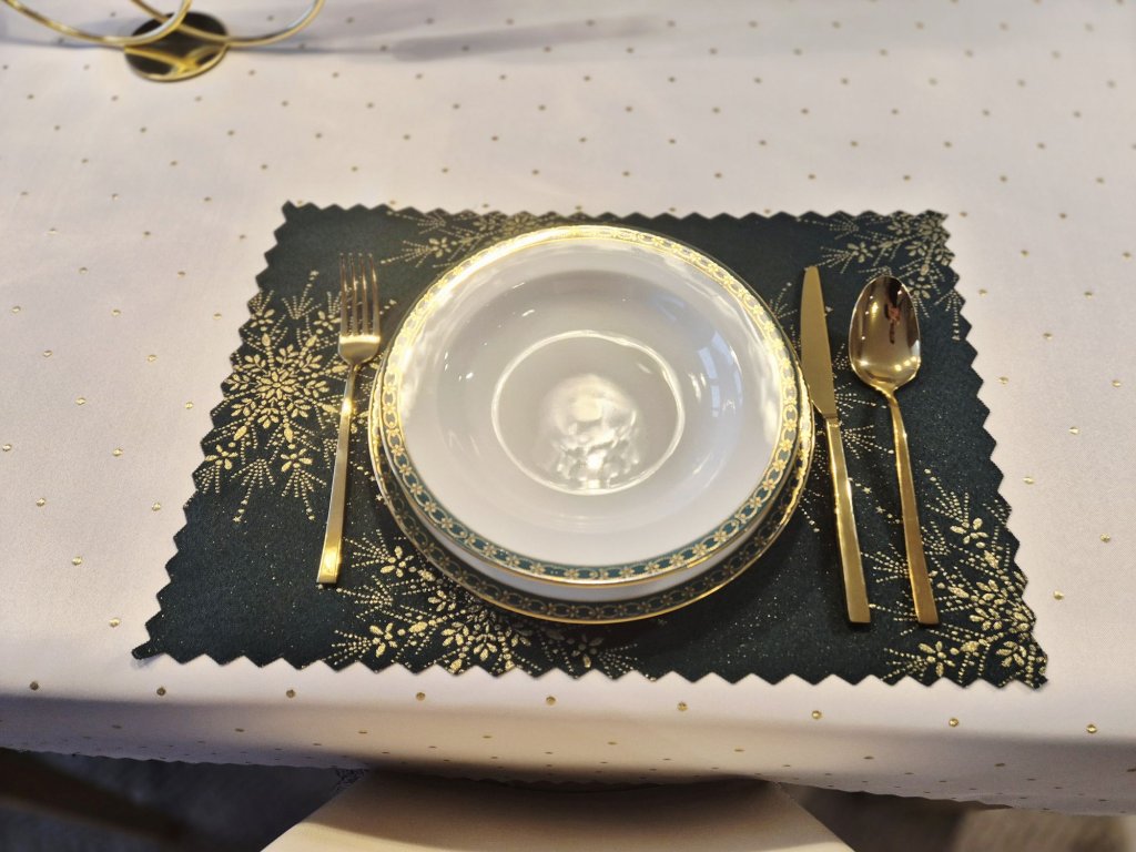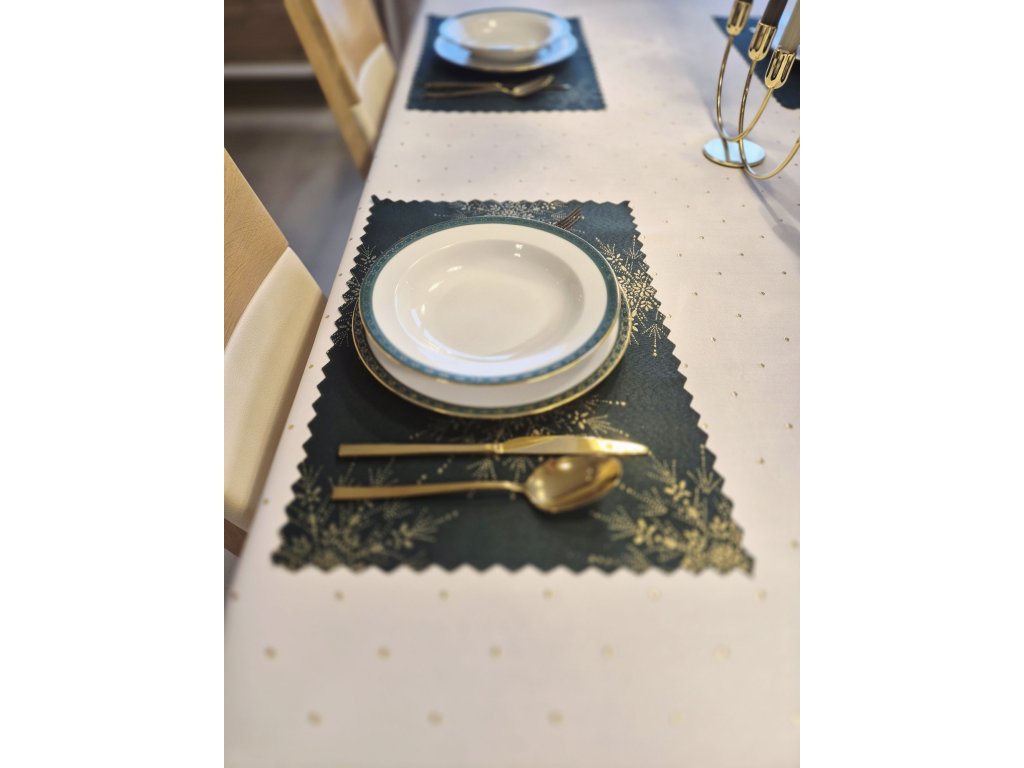 Luxusné vianočné prestieranie v kombinácii farieb tmavozelenej a zlatej, má okrem estetických funkcií aj praktické funkcie. Chráni dosku stola a pritom pôsobí elegantne.