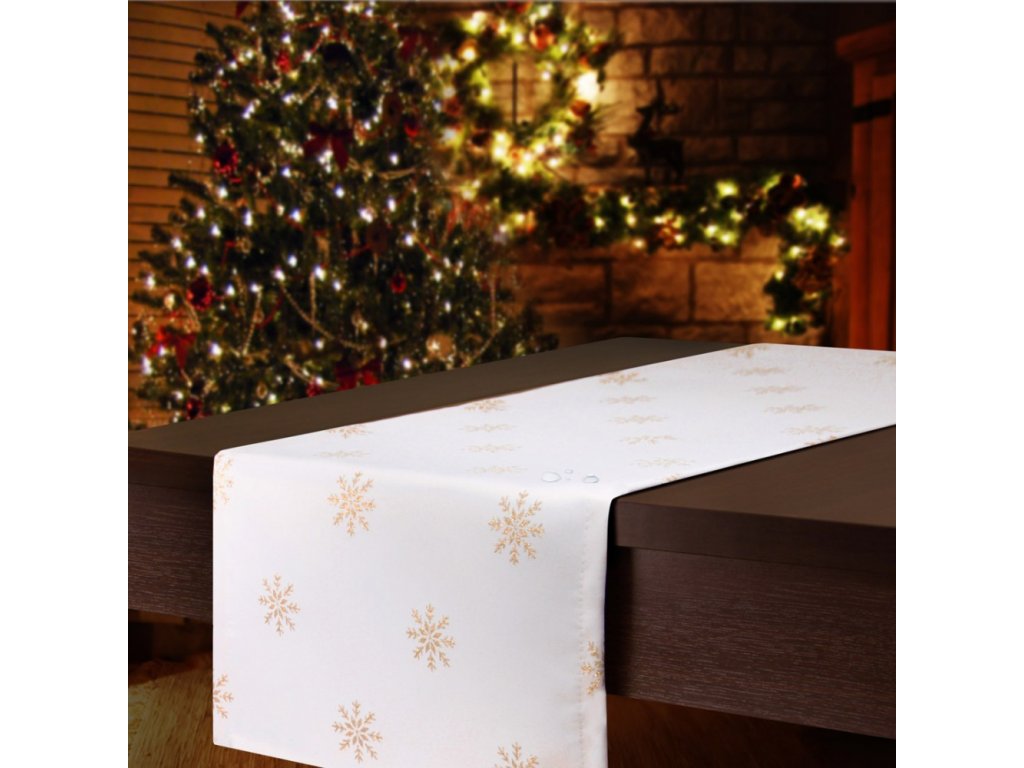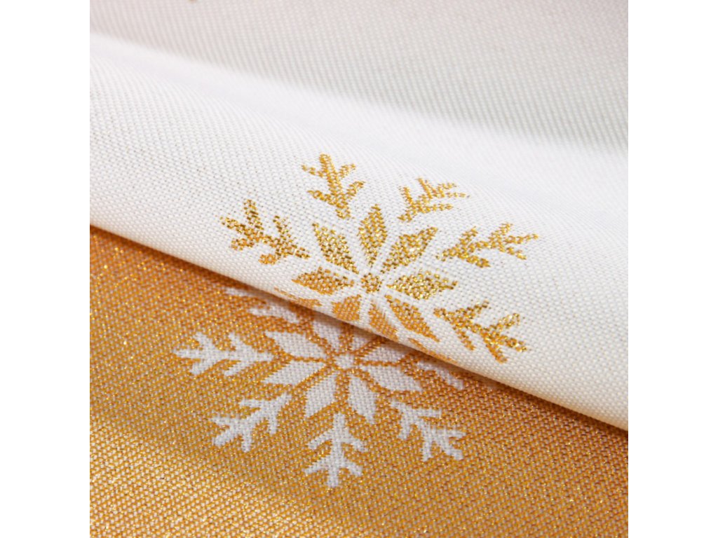 Behúň CHRISTMAS SNOWFLAKE so zlatými dekoráciami v podobe vločiek je dokonalou dekoráciou na stôl, ktorá poslúži ako počas Štedrého večera, tak aj pri iných sviatočných stretnutiach.