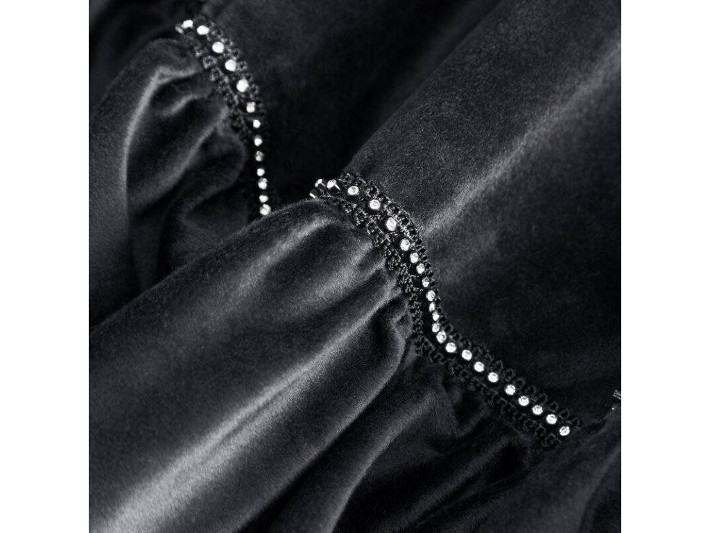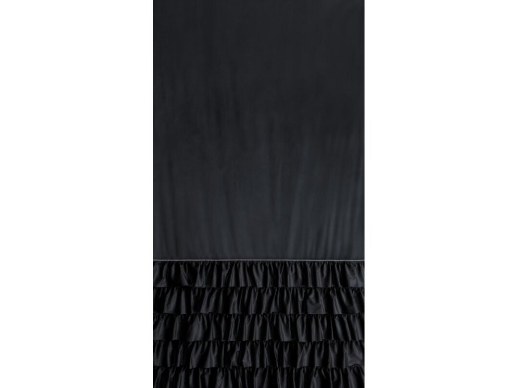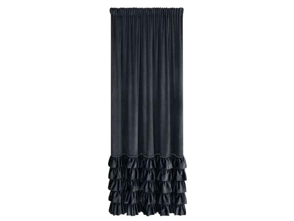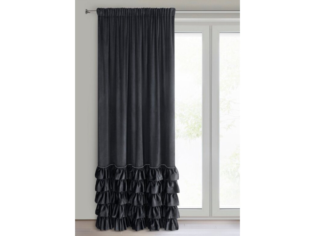 Tento jedinečný dekoratívny prvok nielenže dodá každej miestnosti noblesu, ale zároveň poskytuje pohodlie a súkromie. Mäkká a elegantná zamatová tkanina sa vyznačuje luxusným leskom a hĺbkou farieb. Zamat je známy svojou vynikajúcou tepelnou a zvukovou izoláciou. Exkluzívna tkanina je mimoriadne mäkká a príjemná na dotyk, vďaka čomu zútulní a spríjemní interiér. Spodnú časť závesu zdobia krásne volány, ktoré mu dodávajú ľahkosť a romantickosť. Volány sú oddelené jemným pásikom so zirkónmi, ktorý celku dodáva šmrnc a rafinovanosť. Univerzálna riasiaca páska široká 8 cm, všitá do hornej časti záclony, umožňuje nastaviť hustotu riasenia, takže látka po zavesení na záclonovú tyč pôsobí elegantne. Špeciálna trojcentimetrová záložka nad páskou esteticky zakrýva ťahadlá alebo háčiky, na ktorých je zavesená. Páska má aj tunel, ktorý umožňuje upevniť záclonu na tyčovú záclonovú tyč.