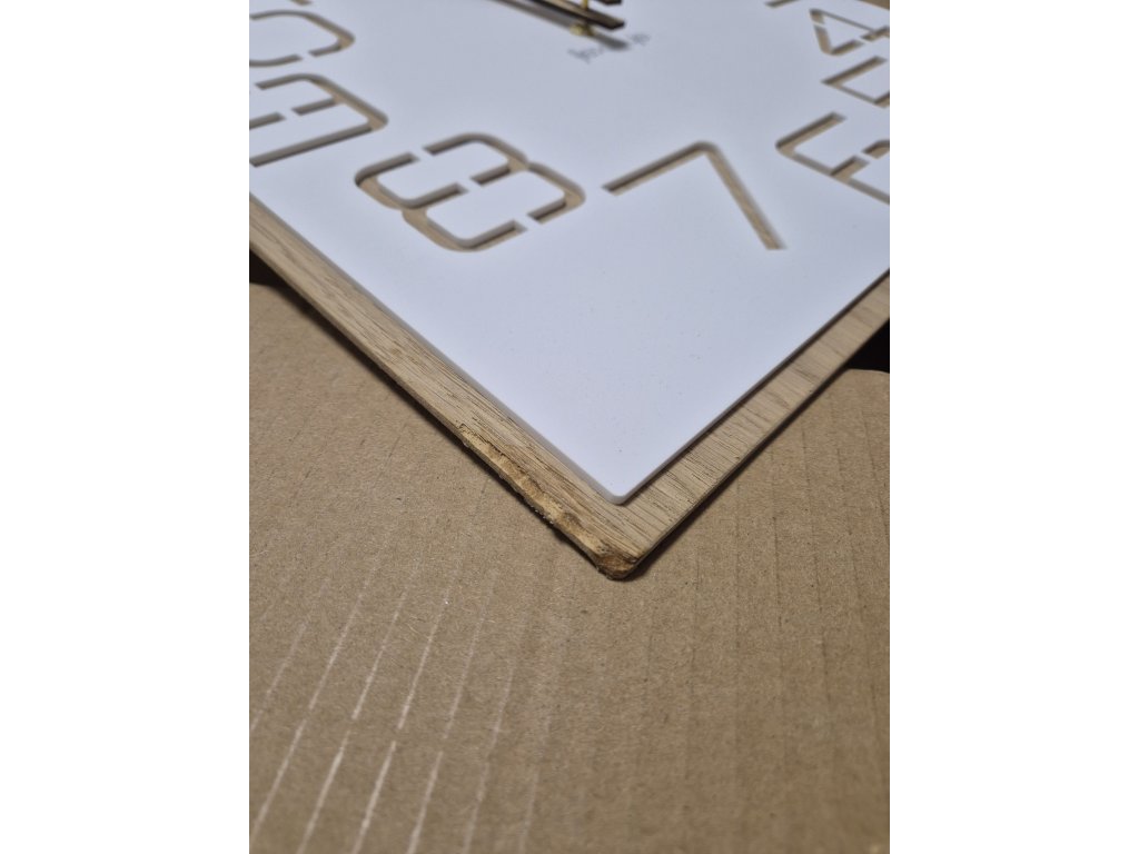 Ponúkame drevené hodiny so zľavou z dôvodu poškodenia. Hodiny majú odštiepené z dreva v ľavom dolnom rohu (viď foto), čo predstavuje kozmetickú vadu. Hodiny sú nové, nepoužívané a plne funkčné. Ideálna voľba pre zákazníkov, ktorí hľadajú funkčný produkt za zvýhodnenú cenu a drobné poškodenie im neprekáža.