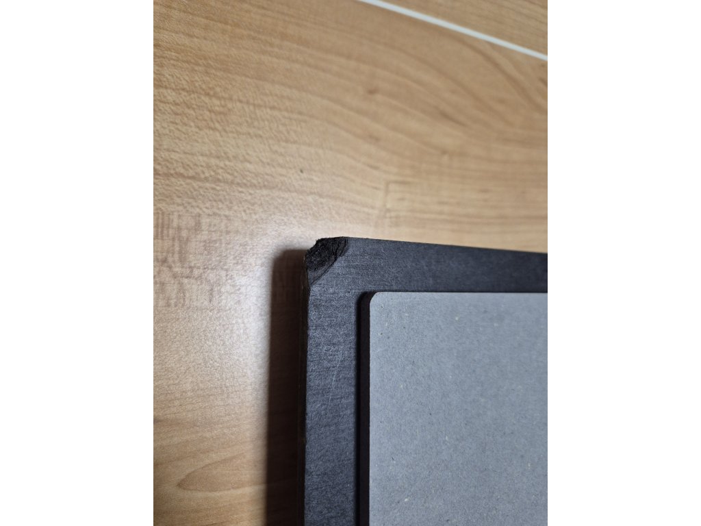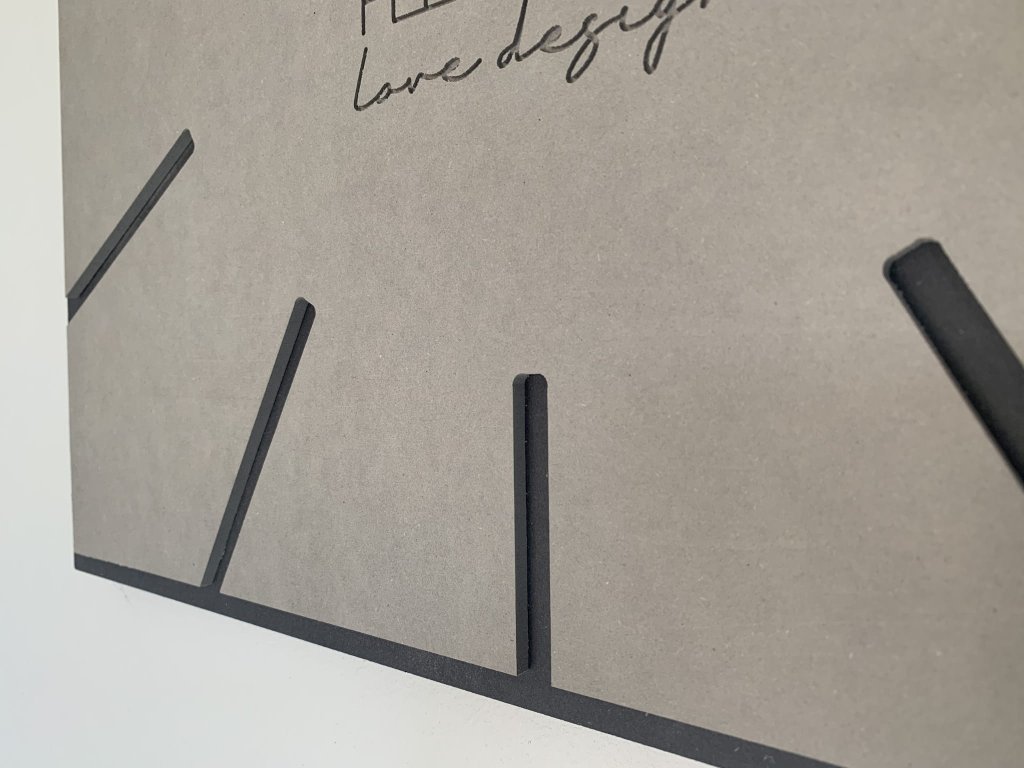 Hodiny sú vyrobené z ekologickej a veľmi tvrdej HDF dosky. Doska je vyrobená z drevených častí zomletých na vlákna, ktoré sa neskôr upravia živicami a organickými farbivami. Po vysušení je doska lisovaná pri vysokej teplote a vysokom tlaku. Takto sa vytvorí doska s vysokou hustotou až o 50% väčšia ako masívne drevo.