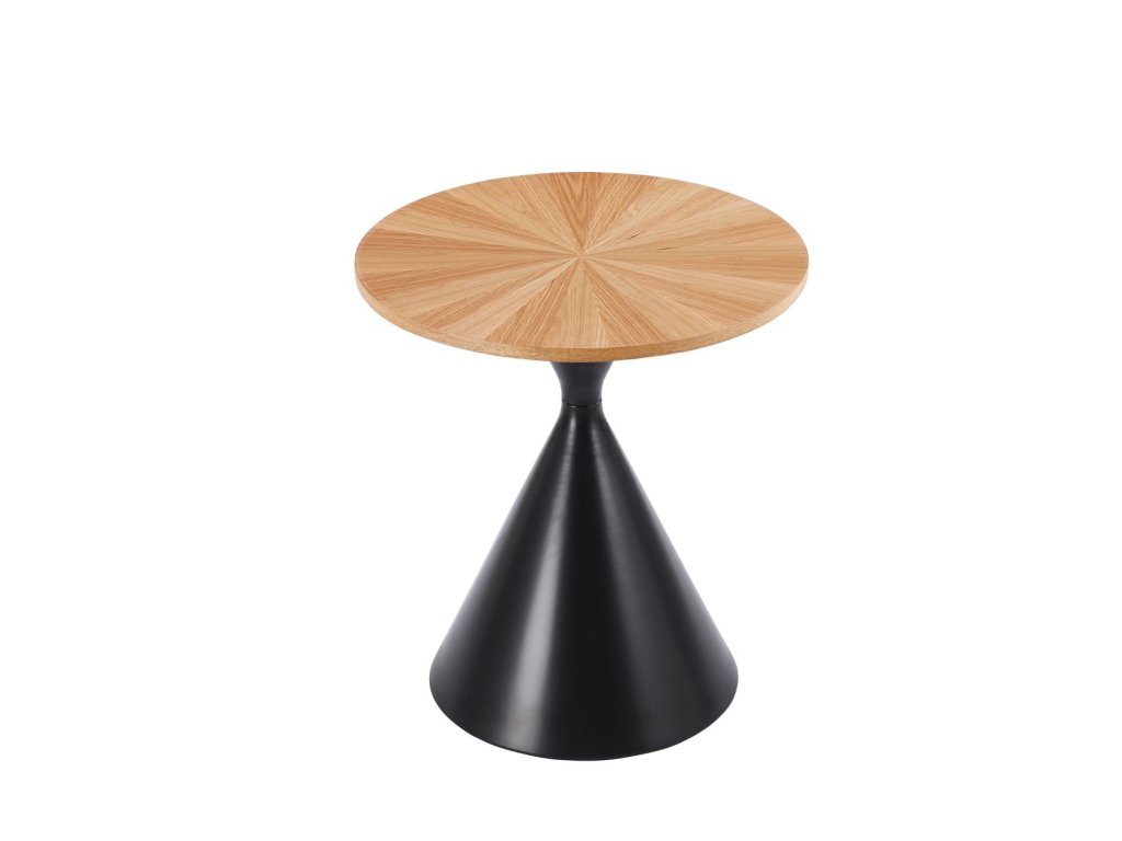 Okrúhla doska s jemnou kresbou dreva pôsobí ľahko a elegantne, zatiaľ čo stabilná kovová noha v kužeľovitom tvare dodáva stolíku originálny charakter a výbornú stabilitu. Vďaka kompaktným rozmerom je stolík ideálny ako príručný alebo konferenčný stolík k pohovke, kreslu či do menších priestorov.