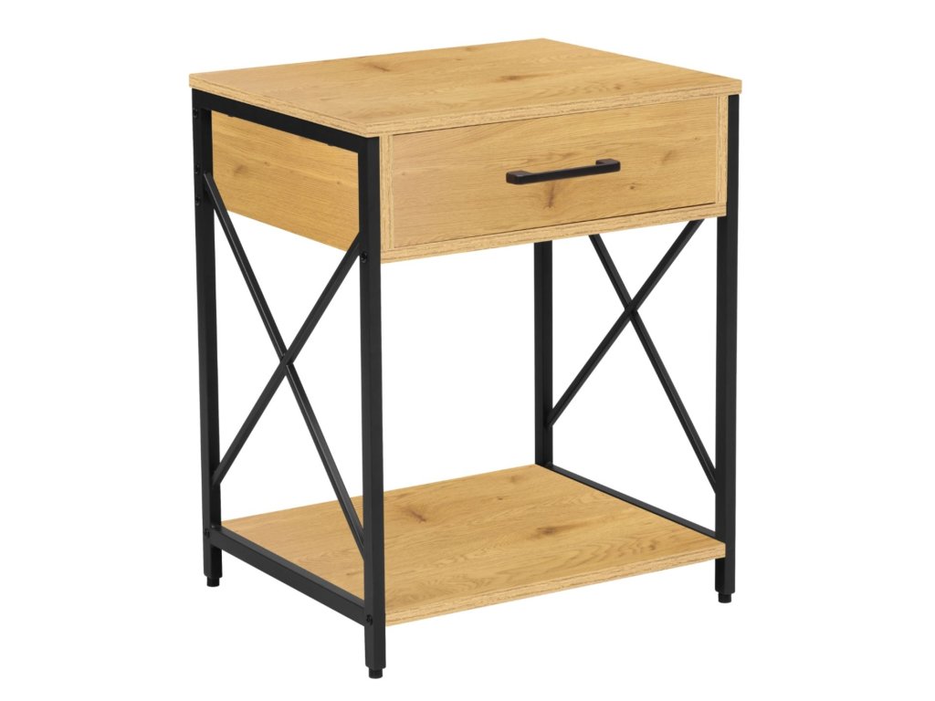 Praktický nočný stolík s dubovou laminátovou doskou a čiernou kovovou konštrukciou je ideálnym riešením pre modernú spálňu. Elegantná kombinácia prírodného dekoru dubu a čierneho kovu dodáva nábytku nadčasový vzhľad, ktorý sa hodí k rôznym štýlom interiéru.