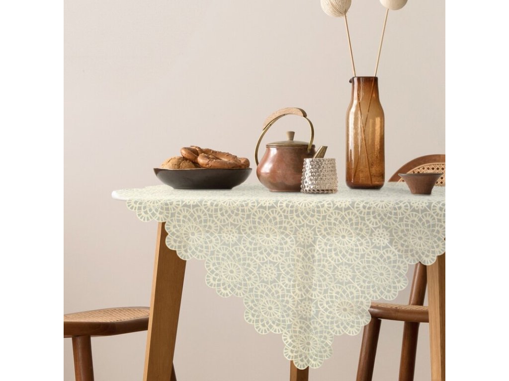 Jemný čipkový vzor pôsobí ľahko a elegantne, no zároveň vytvára výrazný dekoratívny efekt – ideálny na každodenné aj slávnostné prestretie.